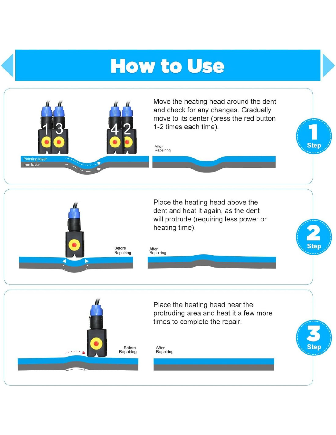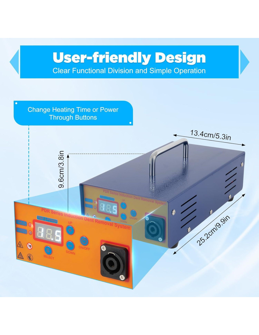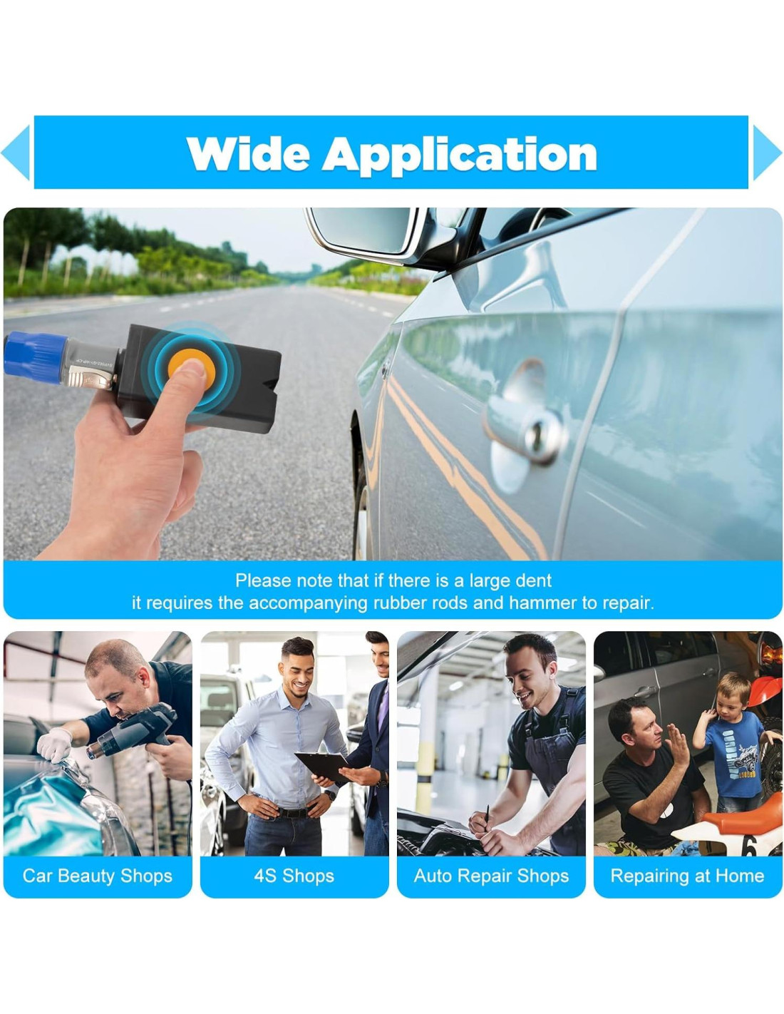 - Rendimiento Sobresaliente: En comparación con las técnicas tradicionales de reparación de chapa, la herramienta de reparación de abolladuras (Potencia máxima 1.38Kw) puede eliminar fácilmente diversas abolladuras redondas y suaves en poco tiempo, haciendo que el trabajo de reparación sea más eficiente y conveniente.