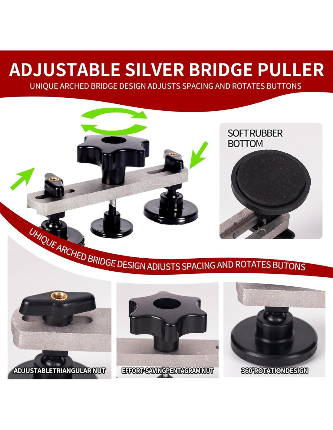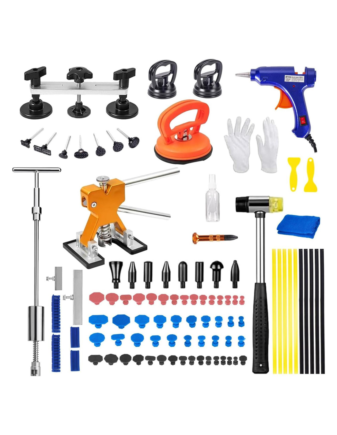 - KIT DE REPARACIÓN DE ABOLLADURAS SIN PINTURA DE 97 PIEZAS - Diga adiós a las costosas reparaciones en talleres de carrocería y dé la bienvenida a nuestro kit de reparación de abolladuras para automóviles con un 98% de eficiencia. La parte inferior del removedor de abolladuras está hecha de goma y no dañará la pintura original. La herramienta de eliminación de abolladuras tira de las abolladuras a través de un fuerte pegamento caliente, y el pegamento caliente es fácil de quitar sin dañar la pintura. Nuestra herramienta removedora de abolladuras para automóviles tiene accesorios completos y se puede usar un número ilimitado de veces.