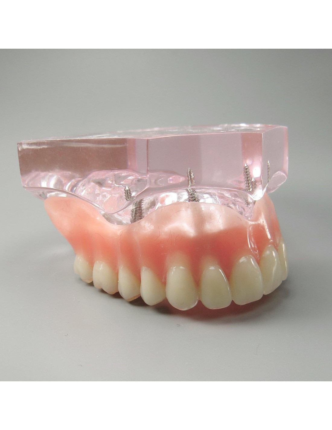 Base de mandíbula superior de acrílico transparente permite ver los implantes. 4 implantes genéricos con sobredentadura superior removible por conexión de localizadores. Bueno para explicar el funcionamiento de la sobredentadura.