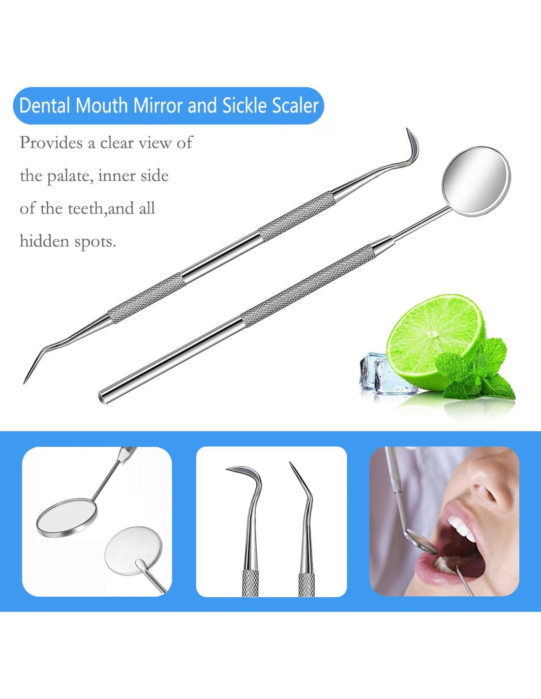 - FÁCIL DE USAR - Las herramientas de cuidado oral están diseñadas en diferentes ángulos y formas, con un espejo bucal adicional de primera calidad, bueno para limpiar manchas orales difíciles, restos de comida, eliminar sarro entre los dientes y las encías.