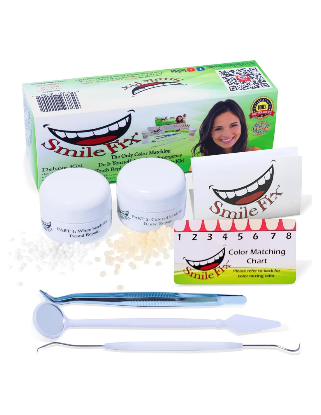 - Fácil de Elegir y Usar: Cada sonrisa es única, y también lo son las reparaciones. Por eso SmileFix ofrece una variedad de opciones, incluyendo Básico (perlas térmicas), Estándar (perlas y coincidencia de color) y Deluxe (perlas, coincidencia de color y herramientas). Cada kit incluye instrucciones claras; sigue los pasos de cerca, y tanto los principiantes como los usuarios experimentados pueden lograr una restauración exitosa. Videos útiles de cómo hacer están disponibles en línea.