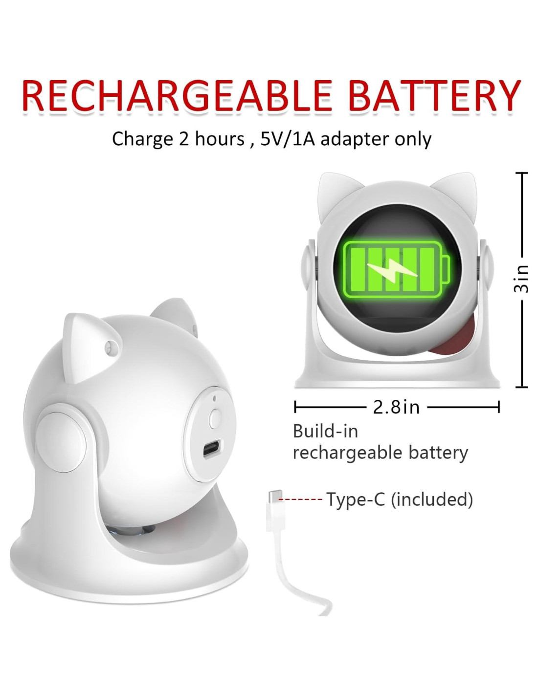 - [Recargable por USB] Los juguetes de láser para gatos tienen una batería recargable incorporada, simplemente cárgalo a través del cable tipo C (adaptador de corriente no incluido), libera tu mente de cambiar la batería. Carga completa en aproximadamente 2 horas./juguetes automáticos de láser para gatos