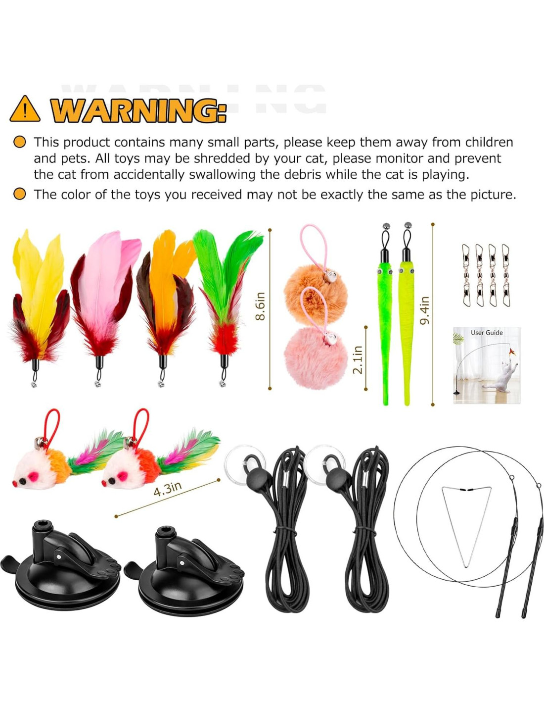 - [Juego de Juguetes para Gatos 3 en 1]- El paquete contiene 2 ventosas, 2 varitas para gatos, 2 bolas de pelaje, 2 juguetes de ratón, 2 juguetes de gusano, 4 juguetes de plumas, 2 cuerdas, 2 almohadillas adhesivas, 1 clip triangular. Todos los reemplazos son universales, son duraderos y mantendrán a tu gato interesado.