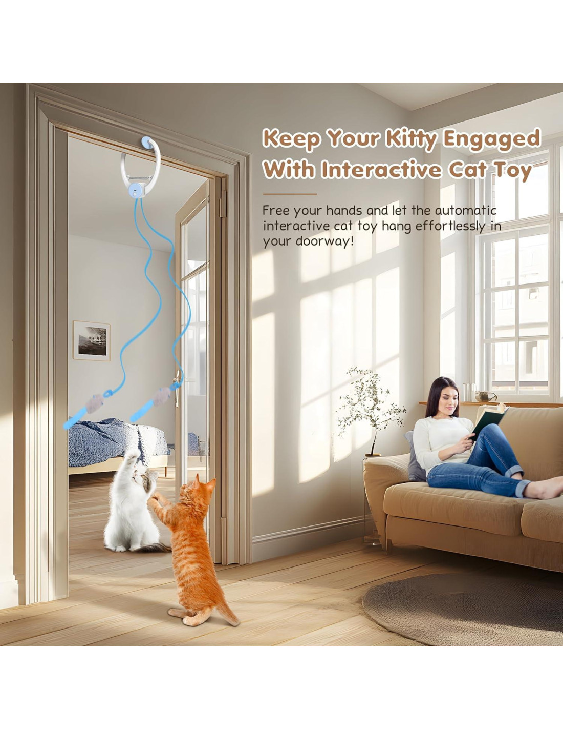 - Colgar los juguetes interactivos para gatos de interior en un marco de puerta o manija y observar cómo se mueven y bailan cuando tu gato interactúa con ellos. Con solo un juguete cautivador, puedes proporcionar una experiencia de juego entretenida para tu querido felino, ayudando a reducir el aburrimiento y la ansiedad, ideal para cuando no estás en casa.
