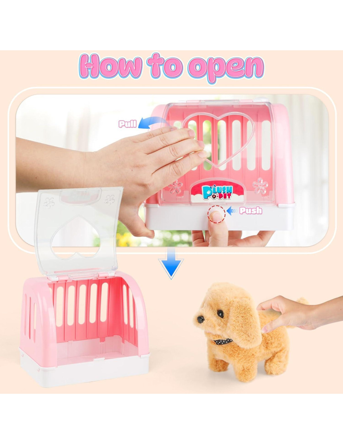- [Lleva a tu mascota a cualquier lugar] Con las baterías ya instaladas, este perrito de juguete camina, ladra y mueve su cola, brindando a los niños una experiencia de mascota realista. ¡Solo agarra la transportadora de mascotas y lleva a tu amigo peludo a donde quiera que vayas!