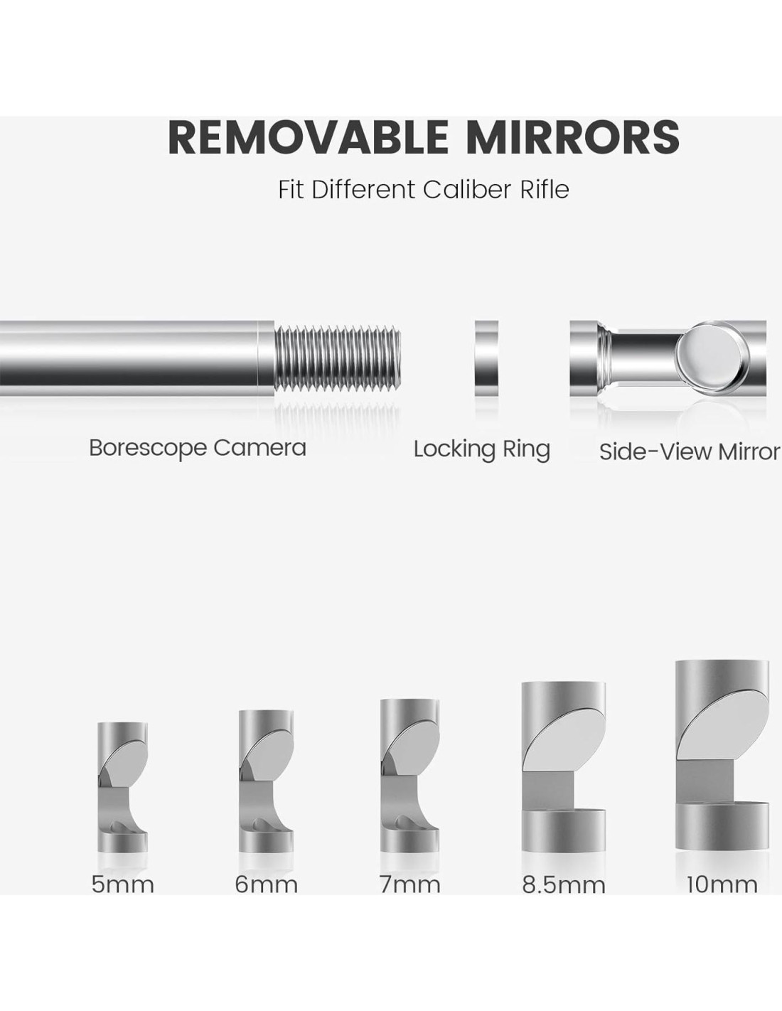 - LUZ LED Y ESPEJO DE VISTA LATERAL - Seis luces LED son ajustables para el brillo y le dan a la cámara una vista perfecta de las áreas de inspección más oscuras. Con el espejo de vista lateral ajustable y desmontable de 90, puedes revisar la pared del caño del rifle, o quitarlo para revisar el punto de disparo. Incluye 4 espejos de diferentes tamaños para adaptarse a diferentes calibres de caño.