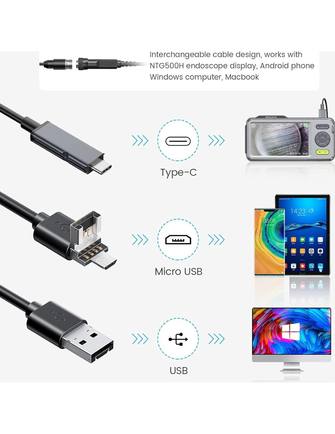- PLUG AND PLAY - FÁCIL DE USAR - Pantalla de color LCD HD IPS de 5 pulgadas incorporada y batería recargable de 3500mAh, este borescope se puede usar inmediatamente después de encenderlo, no es necesario usar tu smartphone para conectar el WIFI y no es necesario descargar ningún software de controlador.