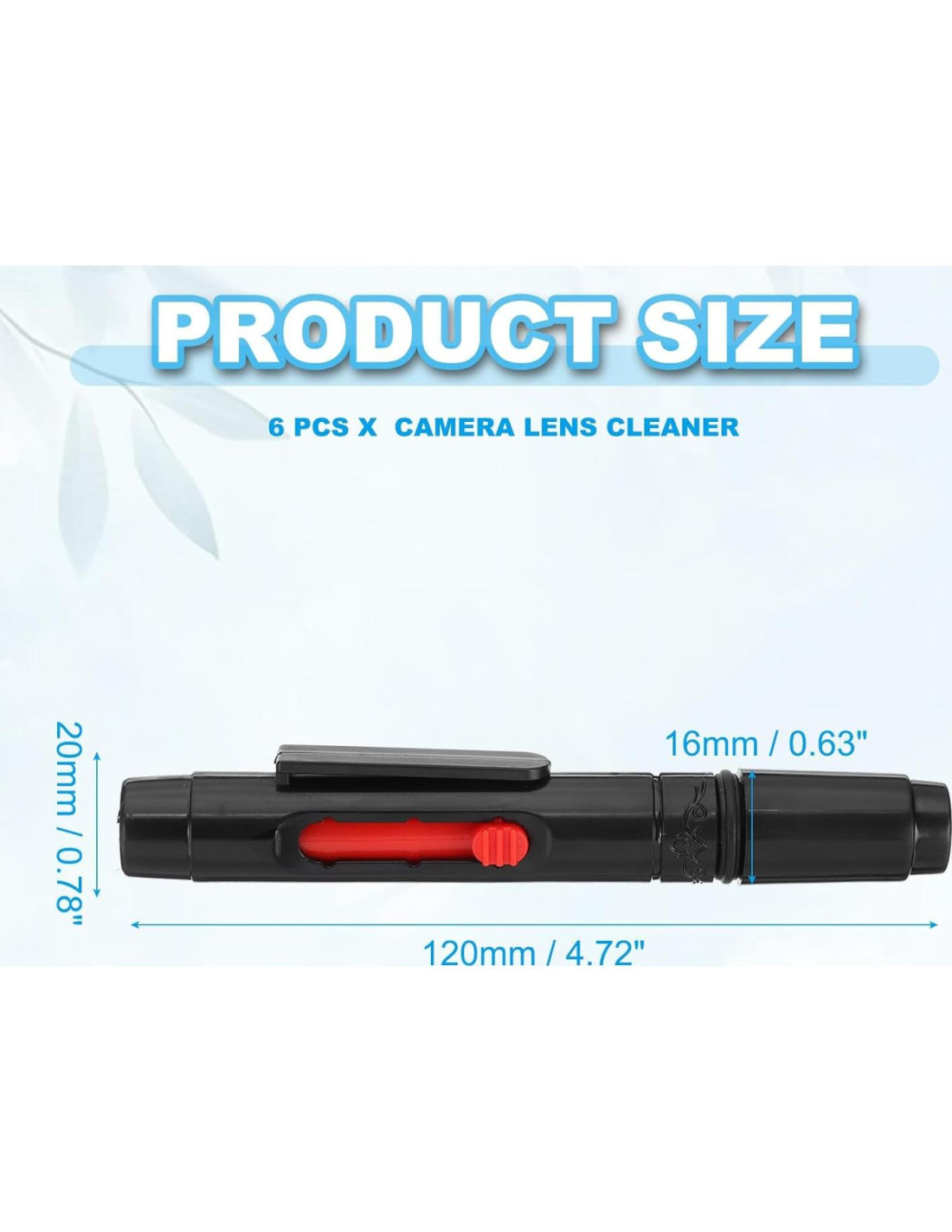 - Tamaño: Color: Rojo; Material: pom-tpu; Tamaño: 20mm x 120mm (0.78 x 4.72 pulgadas); Diámetro del vástago: 16mm (0.63 pulgadas); Lista de Empaque: 6 Pcs x Limpiador de Lentes de Cámara