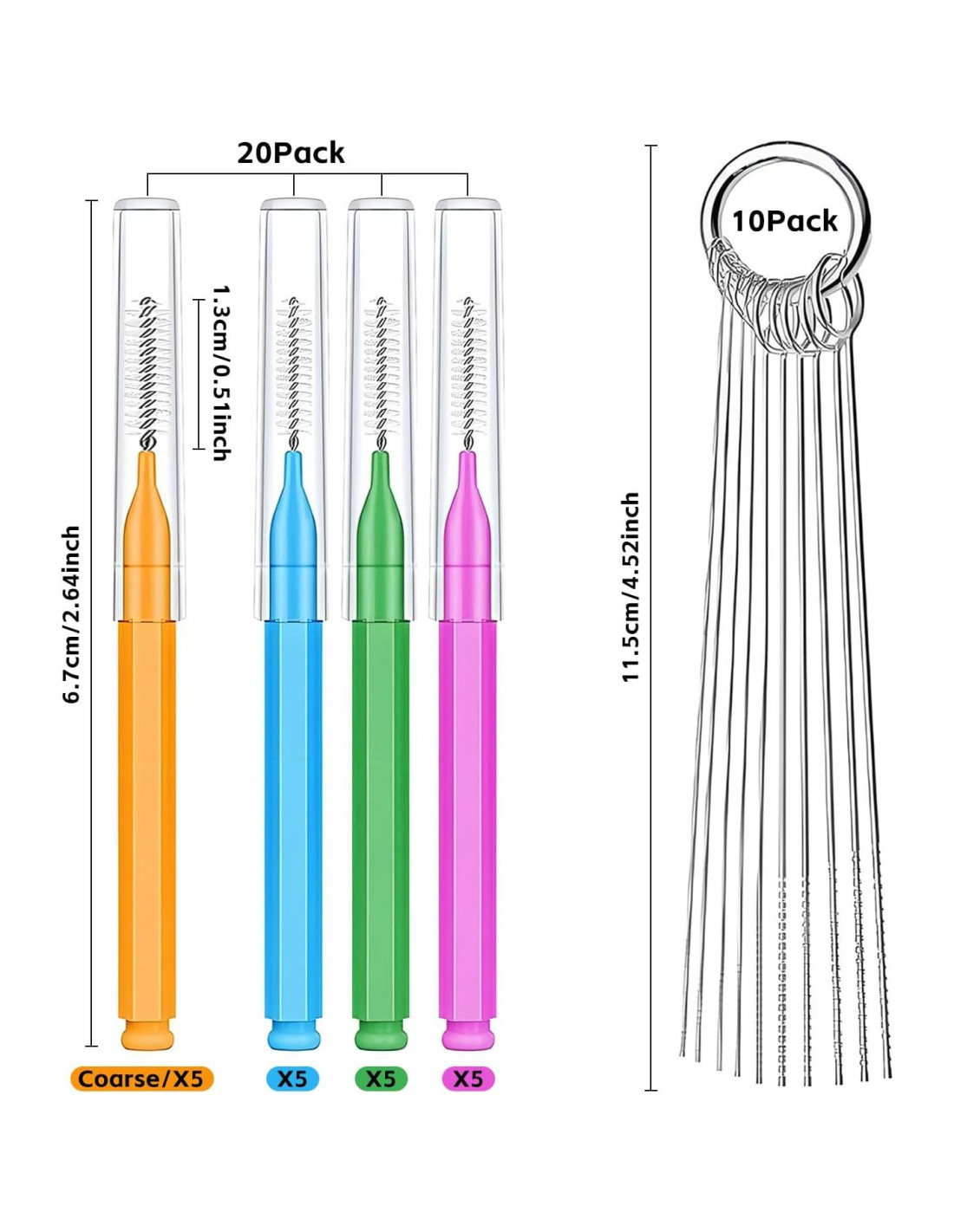 - Almacenamiento Organizado y Duradero - Cada limpiador de cabezal de ducha viene con una tapa protectora para mantener las cerdas limpias e intactas. El juego de 30 piezas incluye 20 cepillos y 10 pines, almacenados en un estuche compacto para fácil acceso en baños o cocinas