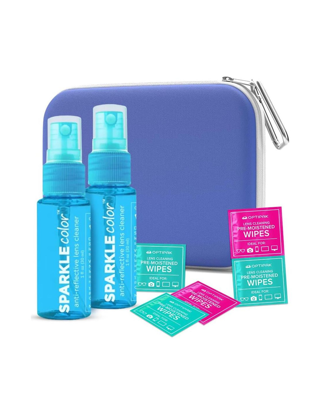 - Kit de Limpiador de Gafas: Este kit de limpieza de gafas incluye dos botellas de spray azul de 30ml, cinco toallitas de lentes prehumedecidas para gafas y una elegante bolsa multipropósito de neopreno azul; perfecta para llevar en tu bolso, mochila o maleta de viaje para una limpieza conveniente en movimiento.