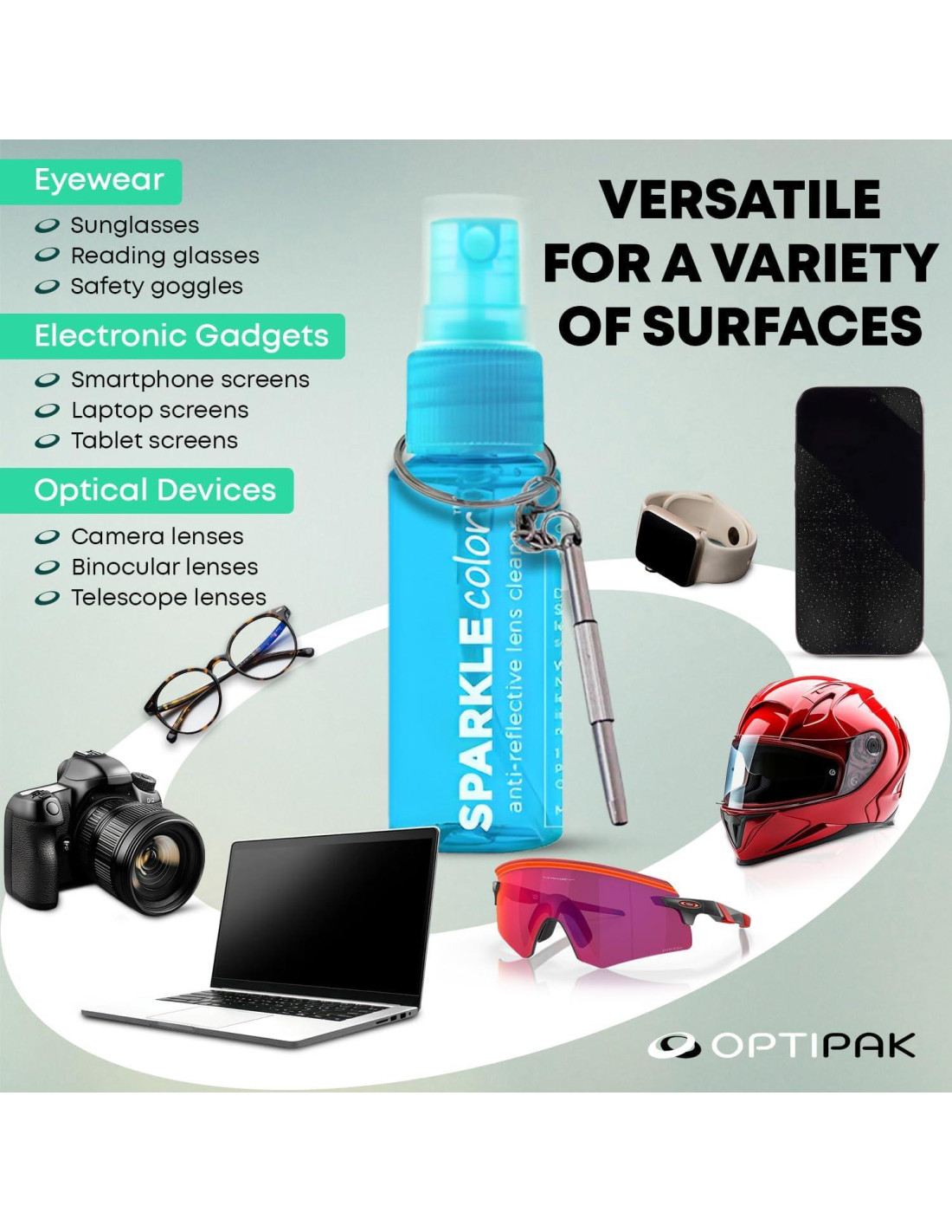 - Sin Rayas y Sin Amoníaco: El kit de limpieza de lentes seguros antirreflectantes de OPTIPAK proporciona un acabado sin rayas, seguro para computadoras, teléfonos inteligentes, binoculares y teclados. Este limpiador de vidrio funciona como spray limpiador de pantallas, spray limpiador de gafas y más.