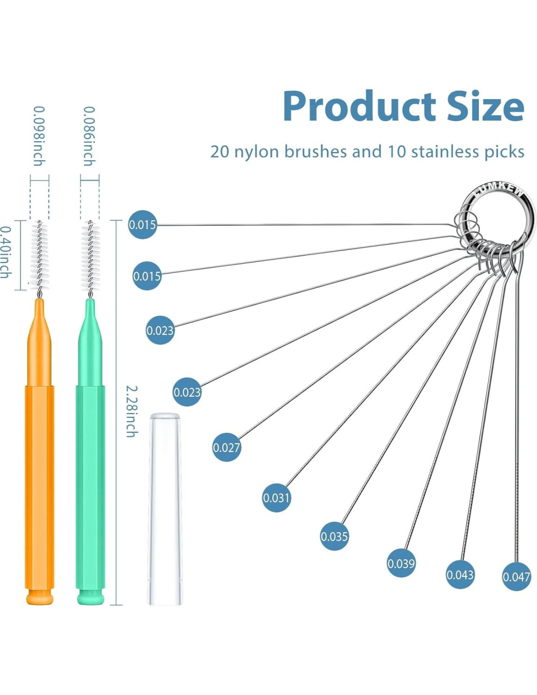 - Múltiples tamaños: El rango de diámetro de las herramientas (0.015-0.05 pulgadas) (0.38-1.27 mm) se utiliza para desalojar la acumulación en los agujeros de rociado de agua. El rango de diámetro de los cepillos (0.086-0.098 pulgadas) (2.18-2.49 mm) limpia los escombros que fueron desalojados por las herramientas