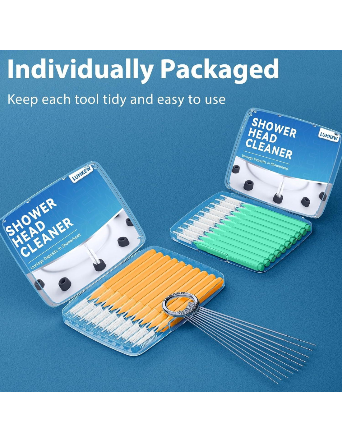 El limpiador de cabezales de ducha de Lumkew cuenta con cerdas pequeñas que llegan fácilmente a los agujeros estrechos para desatascar.