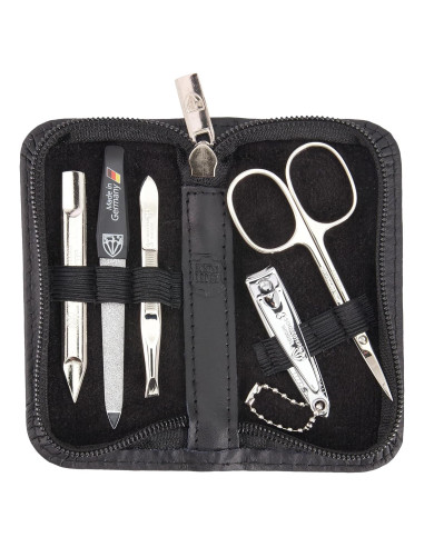 - HERRAMIENTAS DE ACERO: Hechas a mano, niqueladas brillantes (protección contra la corrosión), pulidas y endurecidas. Todos los sets vienen en una atractiva caja de regalo. Los instrumentos están hechos en Solingen / Alemania (excepto el cortauñas).