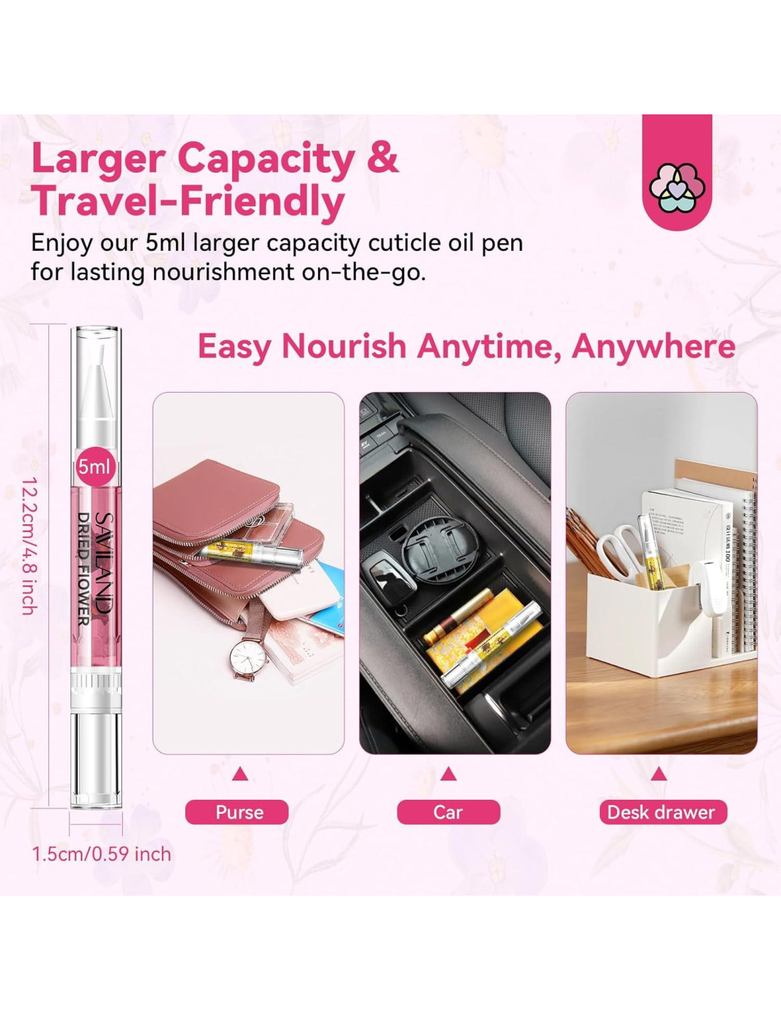 - Aceite Natural para Cutículas: El bolígrafo de aceite para uñas SAVILAND está formulado con Aceite de Almendra Dulce, Nueces, Semilla de Girasol y Aceite de Aguacate, así como Vitaminas A, B, D y E. Esta combinación a base de plantas penetra profundamente en tu piel con humedad, trabajando para prevenir el pelado mientras sana las uñas y manos dañadas y agrietadas. El bolígrafo para cutículas también está infusionado con flores reales premium: Manzanilla, Té Verde, Lavanda, Romero, Jazmín y Rosa, entregando una fragancia cautivadora