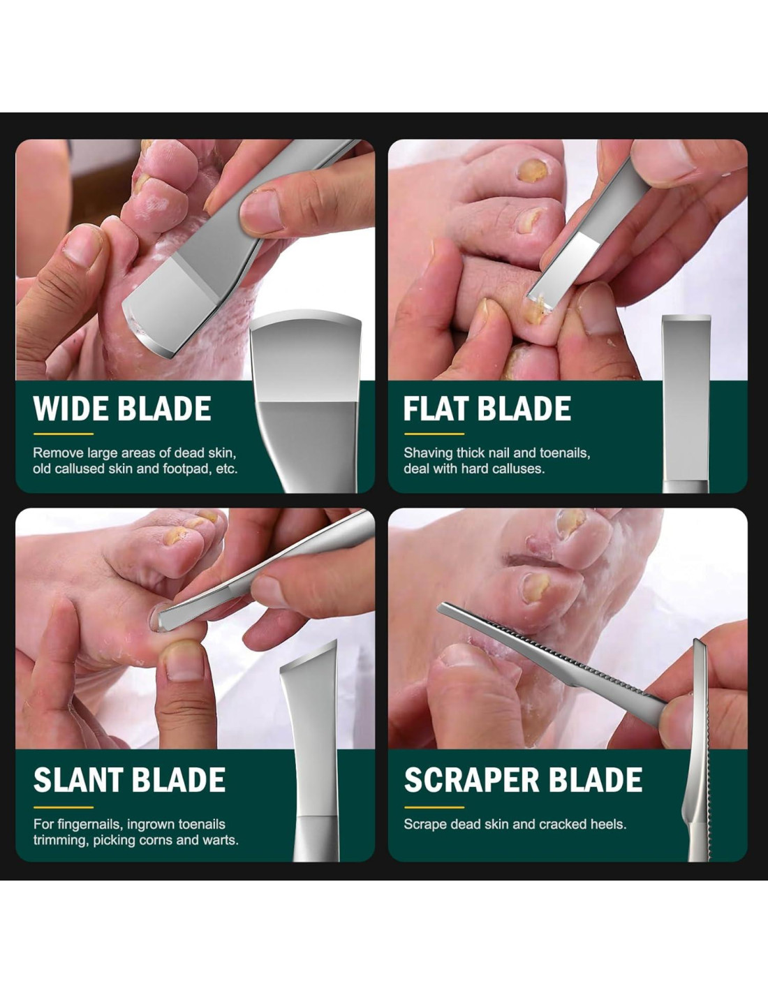 - Cuatro cuchillas, innumerables soluciones - Desata el poder de la perfección en los pies con nuestro kit de eliminación de uñas encarnadas FVION de 4 piezas. Con una cuchilla de hoja ancha y curva, cuchilla de hoja inclinada, cuchilla de hoja plana y cuchilla de hoja recta, este kit es tu secreto para la excelencia en el cuidado de las uñas.