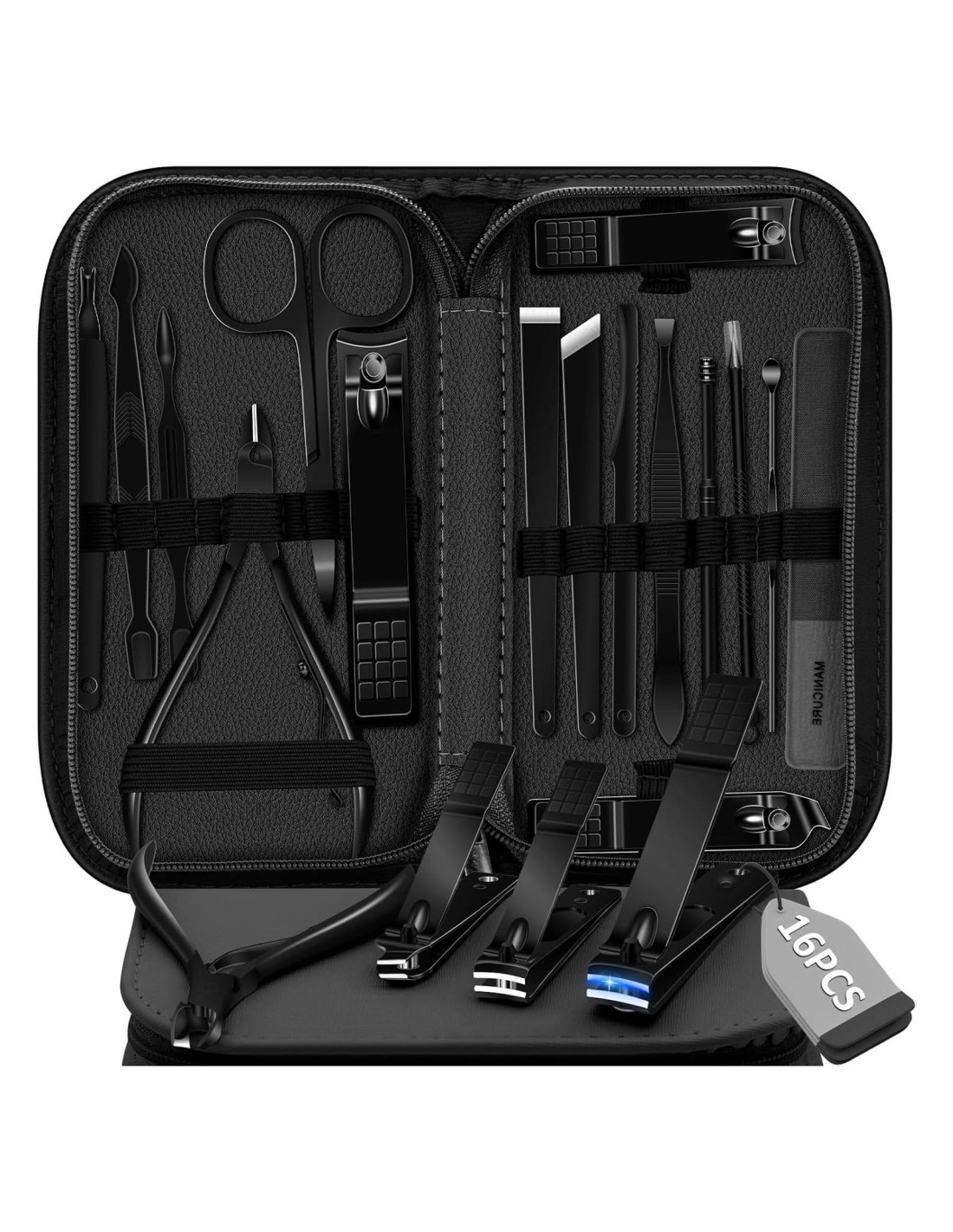 - Kit de Manicura 16 en 1 - El set profesional de manicura y pedicura incluye herramientas de cuidado de manos: Cortauñas Curvado, Cortauñas Oblicuo, Raspador de Uñas, Limpiador de Uñas, Lima de Uñas de Vidrio y Empujador en Forma de V; sets de cuidado de uñas de los pies: Alicates para Piel Muerta, Cortauñas para Pies, Cuchillo de Pedicura Plano, Cuchillo de Pedicura Oblicuo, Cuchillo de Pedicura Curvado; kits de aseo facial: Tijeras, Aguja para Acné, Cucharita para Oídos, Cucharita en Forma de Miel para Limpiar Oídos, Pinza para Cejas. Un conjunto completo de herramientas de cuidado de uñas/pies/facial para satisfacer tus necesidades diarias.