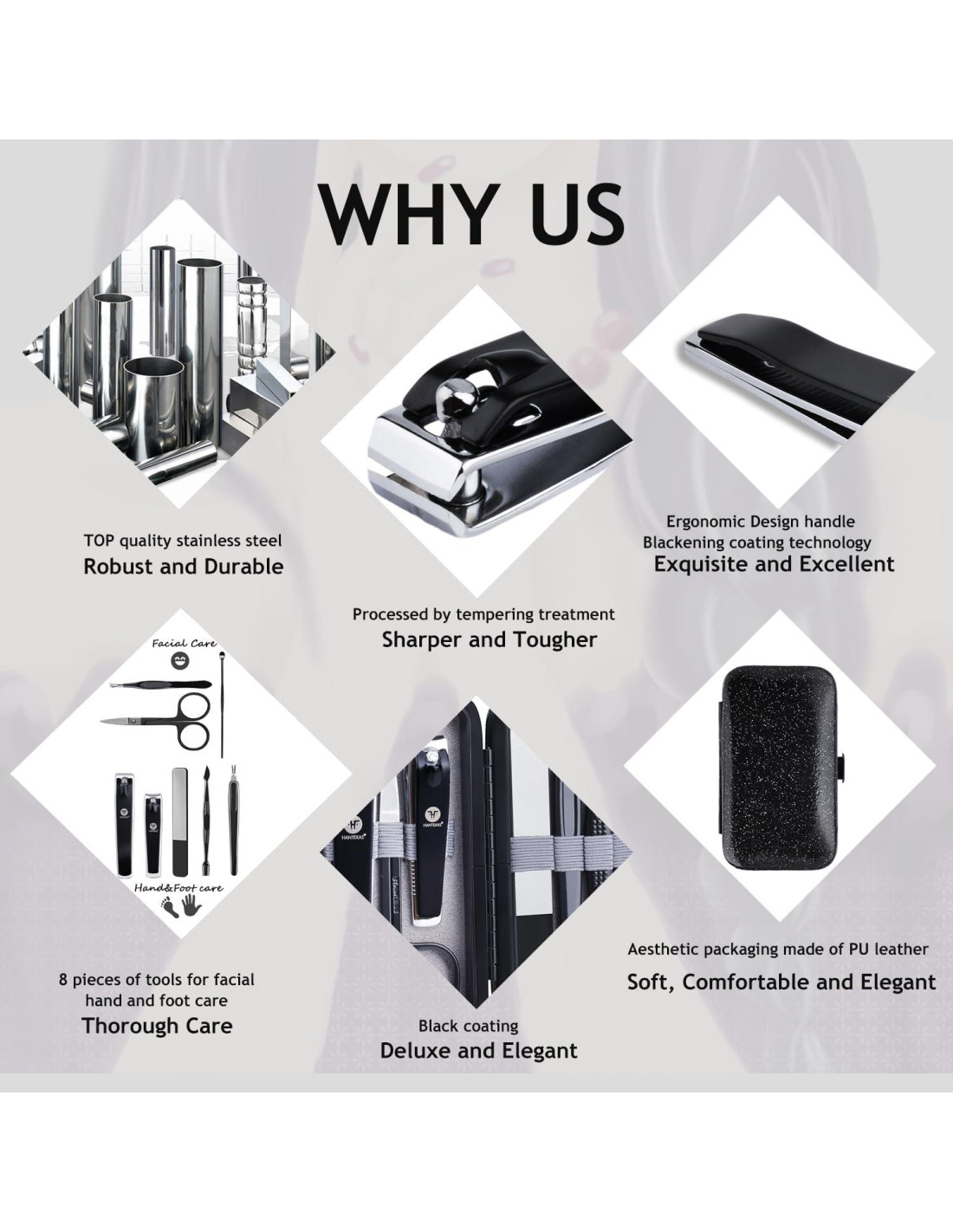 - [ Material Premium y Bien Hecho ] Este es un kit de cuidado de uñas de calidad premium meticulosamente elaborado para hombres, niños, adolescentes, ancianos, mujeres y niñas. Los bordes de las cuchillas de los cortauñas están afilados dos veces cuidadosamente, lo que permite agudeza y precisión. Hecho de acero inoxidable y acero al carbono de alta calidad, recubierto con un tratamiento anti-óxido y níquel, y cada herramienta hecha con diseño ergonómico y adaptada para que la uses de manera efectiva y eficiente, cuidarás de tu rutina diaria de cuidado personal con satisfacción y alegría.