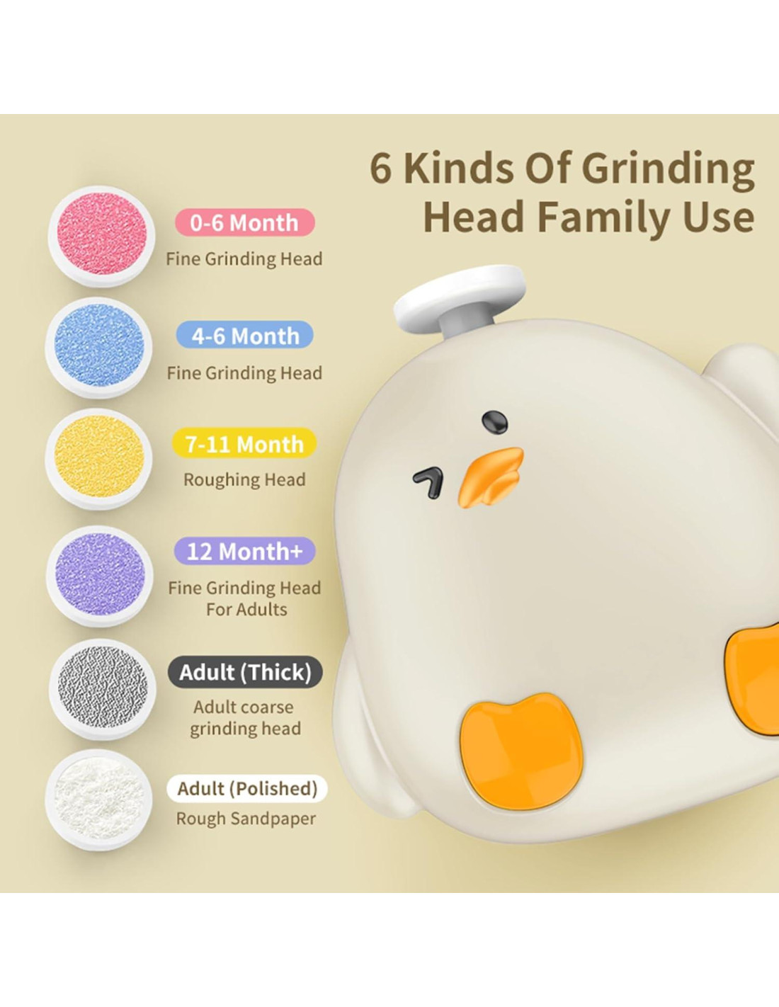 - Elegante y Compacto: El recortador de uñas eléctrico para bebés GEREFET presenta un diseño de caricatura de pollito lindo, acompañado de múltiples cabezales de pulido de colores y una caja de almacenamiento portátil, haciéndolo tanto elegante como práctico. Un kit de cuidado imprescindible para bebés.