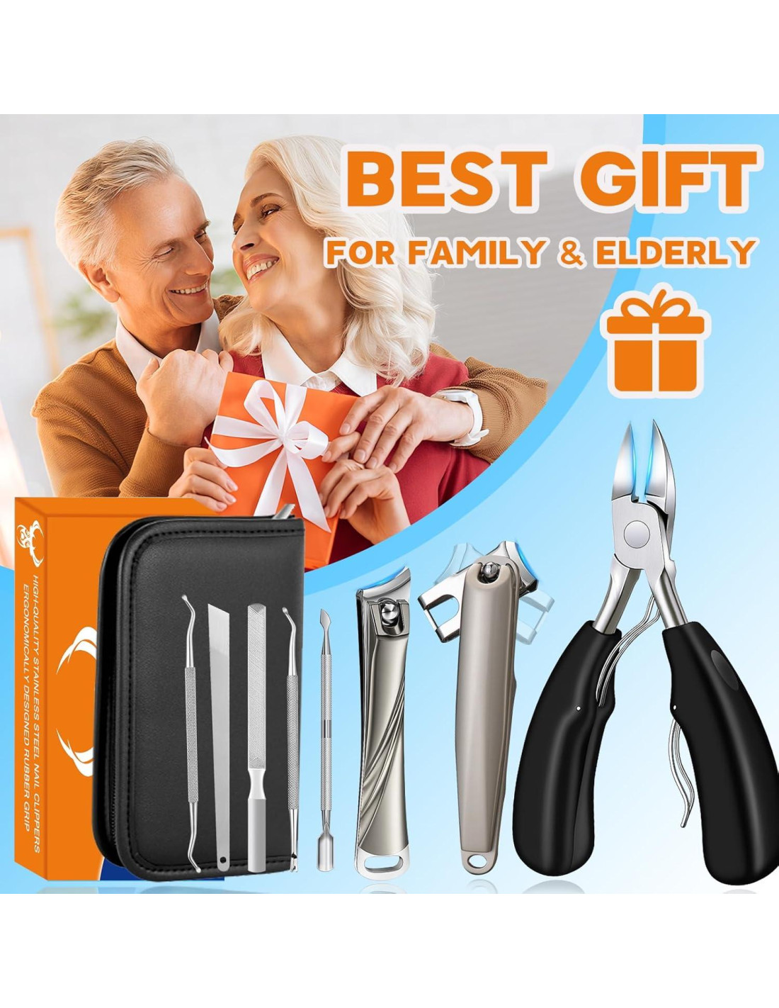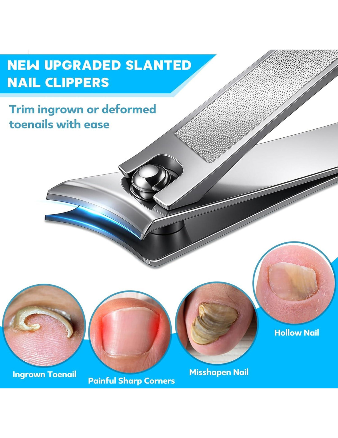 - Cortauñas Angulados Mejorados de 45: Este cortauñas angulado recién mejorado presenta un diseño biomimético en forma de 7, brindándote una vista clara de la hoja y las uñas para un corte más preciso, sin más doblar o torcer incómodamente. La superficie de corte es un 30% más grande que la de los cortauñas angulados regulares, con cuchillas más afiladas para un corte sin esfuerzo. Ideal para usuarios mayores o individuos con movilidad limitada, especialmente aquellos con uñas gruesas o encarnadas severamente.