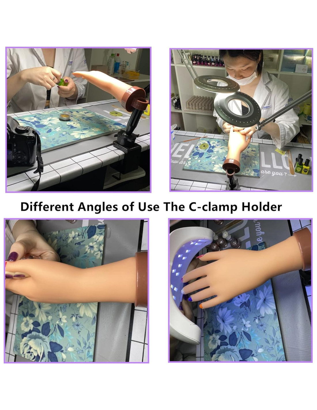 - Ventajas: La mano de práctica de uñas acrílicas puede doblarse a cualquier posición a voluntad, y no habrá pliegues. Mano falsa mejorada para uñas falsas y las uñas no se caerán fácilmente. El soporte en C contiene una almohadilla suave antideslizante, que puede fijarse más firmemente en el escritorio y no se deslizará fácilmente. Puede girar 360 y inclinarse (30). Después de terminar la práctica de uñas, este soporte también puede ser un soporte para cabezas de peluca.