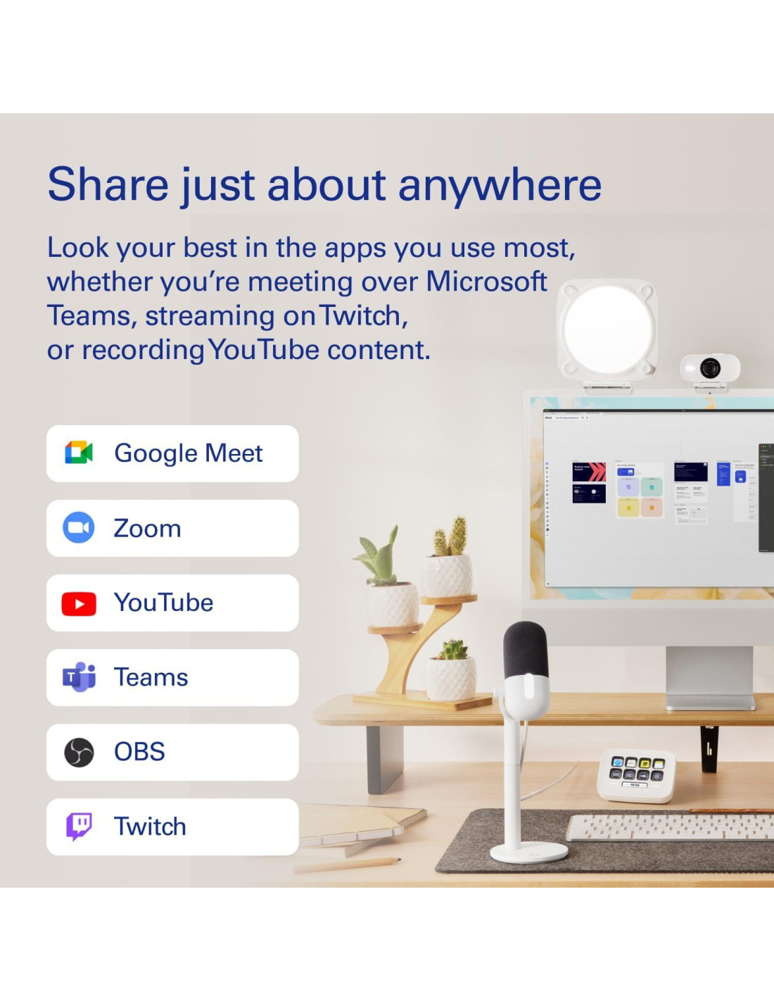 - Un acabado profesional en todas las plataformas: disfruta de un aspecto profesional en YouTube, Teams, Zoom y más, gracias a los ajustes adaptados a todos los tonos de piel, incluyendo para la luminosidad y la temperatura de color.