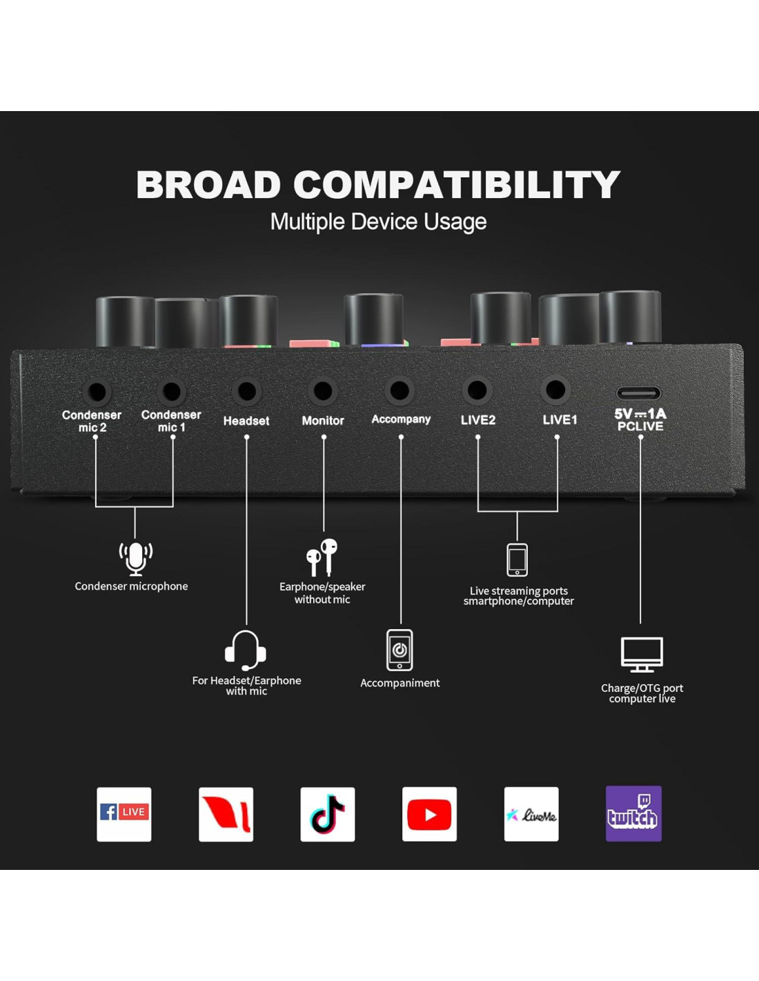 - Facilitar el Streaming: Interfaz intuitiva y fácil de usar para mantener el enfoque en la creación de contenido o streaming sin distracciones innecesarias. disfruta de la facilidad de un clic para silenciar, perillas de ajuste de múltiples canales, logrando sin esfuerzo audio en tiempo real, proporciona música de acompañamiento con entrada Bluetooth, fácil de configurar, diseño portátil y compacto que hace que tu podcasting sea más fácil y eficiente