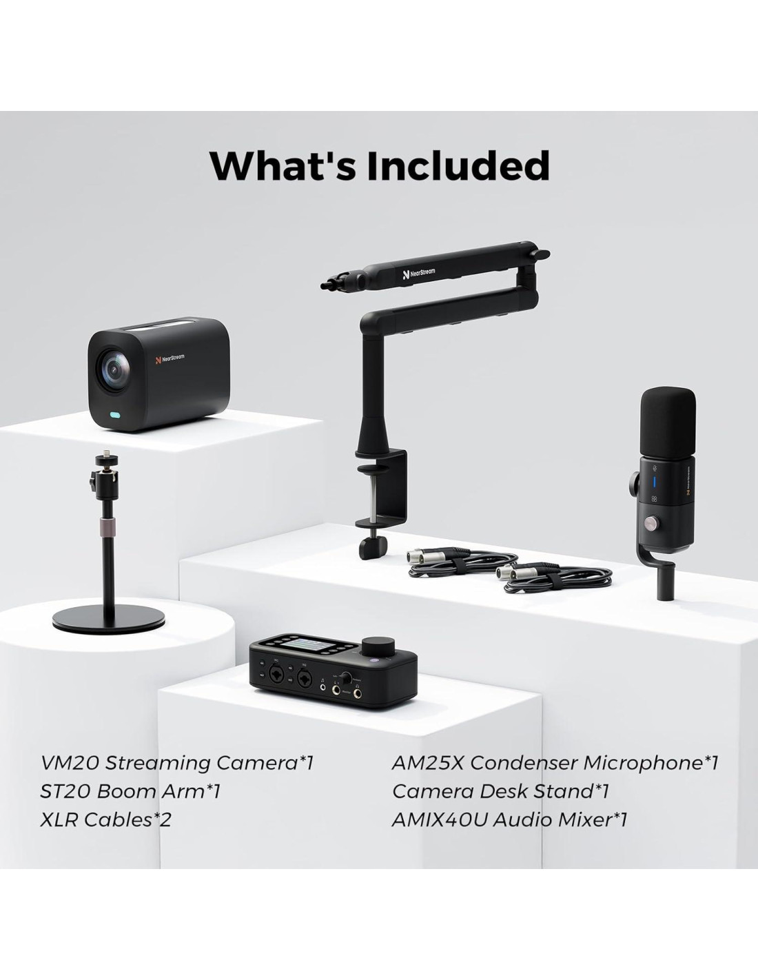 - ¿Qué puedes obtener?: 1 Cámara de Streaming VM20, 1 Micrófono AM25X, 1 Brazo de Soporte ST20, 1 Mezclador de Audio AMIX40U, 1 Soporte de Escritorio para Cámara y 2 Cables XLR.