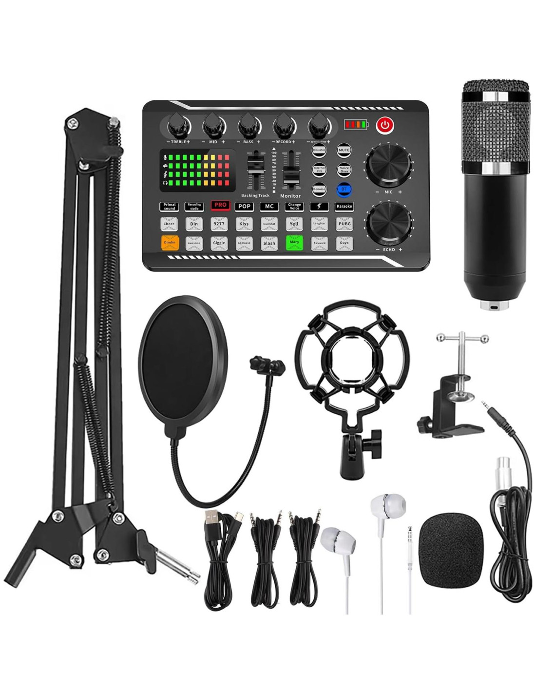 - [Lo que recibirás] 1* Tarjeta de Sonido F998, 1* micrófono de condensador BM800 negro, 1* auricular, 1* cable de micrófono XLR a 3.5mm, 1* brazo de micrófono, 1* soporte de choque, 1* filtro antipop, 1* tapa de espuma anti-viento, 1* cable de carga USB a Tipo C, 2* cable de audio TRRS de 3.5mm, 1* manual del usuario, 1* instrucciones.