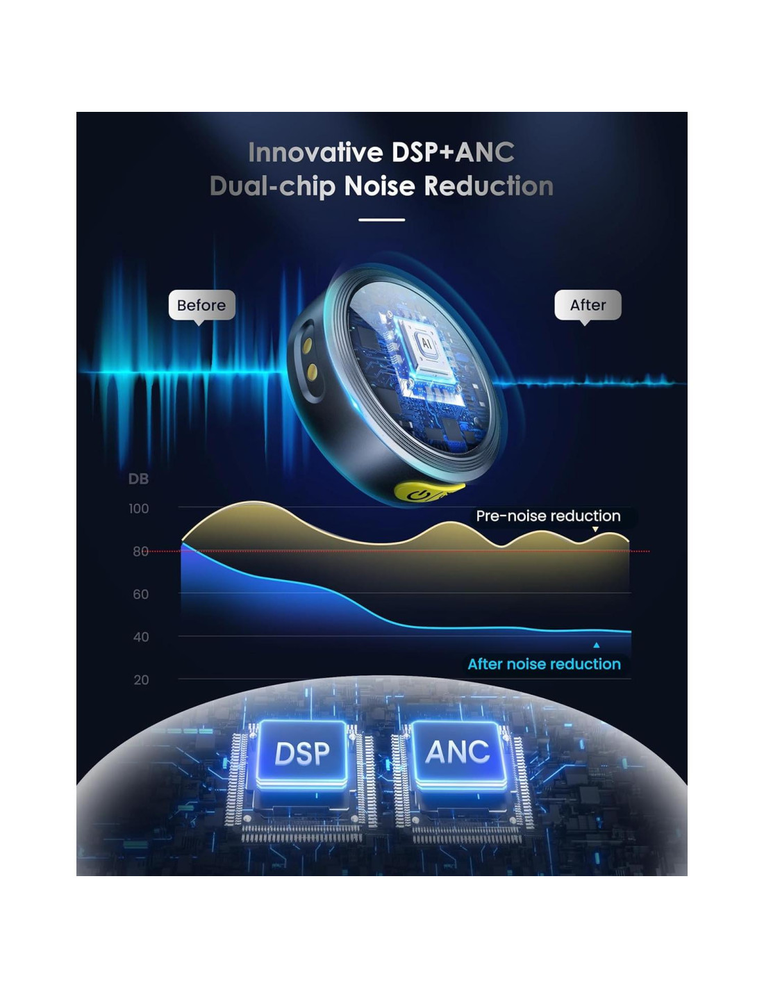 - Captura de Sonido Profesional Hi-Fi: Experimenta grabaciones de audio de calidad de estudio de 48kHz/24bit, capturando cada detalle con precisión. La relación señal-ruido (SNR) de 70dB asegura audio claro incluso en entornos ruidosos. Con un nivel de presión sonora (SPL) de 112dB, graba sonidos fuertes sin distorsión. La Cancelación de Ruido HD 2.0 avanzada minimiza el ruido de fondo, haciéndolo perfecto para transmisiones, entrevistas y grabaciones en alto ruido.