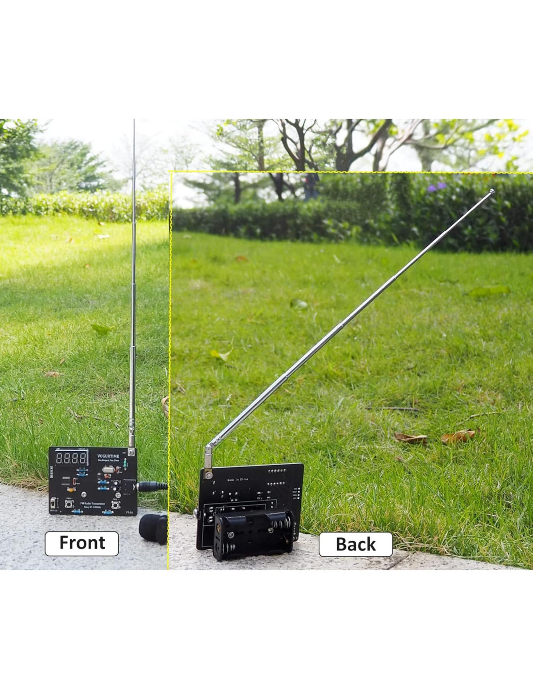 Este kit de transmisor de radio FM para soldar está bien hecho, después de que termines de soldar e instalar, usa el micrófono o el cable de audio, realmente puedes transmitir a una radio FM, lo cual es muy genial FÁCIL Y DIVERTIDO DE SOLDAR Dos chips IC están bien soldados en la placa, no te preocupes por la parte de soldadura SMD. Las marcas claras y las almohadillas de soldadura también te permitirán terminarlo fácilmente. No importa si se usará como un kit educativo para enseñar electrónica o soldarlo con tus queridos niños, tendrás un tiempo increíble, definitivamente estarán orgullosos de sí mismos cuando terminen, especialmente cuando te diviertas con ello! SIMPLE DE USAR CON UNA RADIO FM Se puede usar con nuestra radio (ASIN: B07YH8V2KS). Presiona largo o corto los dos botones del transmisor o ajusta la radio para mantener sus frecuencias iguales. (Intenta evitar la banda de frecuencia densa y fuerte donde se encuentra la estación de radio local). La radio no tiene sonido cuando está emparejada, conecta el micrófono o el cable de audio en la interfaz de audio, puedes escuchar tu voz o equipo de audio desde la radio. Para experimentarlo mejor, intenta usarlo en un área abierta tanto como sea posible porque el entorno de ondas electromagnéticas interiores es complicado. Algunos Parámetros Que Te Pueden Interesar 1) Frecuencia de operación: 87108MHz 2) Longitud del micrófono: 100cm (39.37 pulgadas) 3) Longitud del cable de audio: 50cm (19.68 pulgadas) 4) Longitud de la antena: 31.5cm (12.4 pulgadas); tipo retráctil de 5 secciones; rotación de 360 grados 5) Equipos receptores: teléfono móvil de audio con función de radio 6) Distancia de transmisión: 0100m También incluimos instrucciones en papel colorido en el paquete para ti, cualquier necesidad o pregunta, no dudes en hacérnoslo saber ¡Diviértete con el kit de transmisor de radio FM!