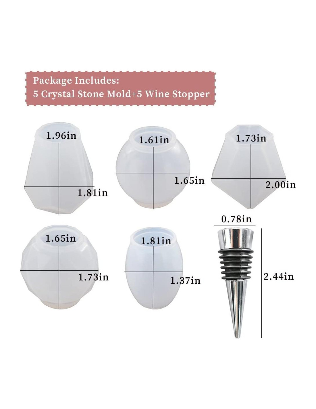 - [TAPÓN DECORATIVO DE PIEDRA DE CRISTAL] Recibirás 5pcs molde de resina de piedra de cristal + 5pcs tapones de vino de aleación. Una variedad de moldes de formas geométricas y accesorios, pueden ayudarte a hacer muchos tapones de botella de vino brillantes, ideales para hacer regalos para familiares o amigos en cumpleaños, Día del Padre, Día de la Madre, Día de San Valentín, Acción de Gracias, Navidad y más.