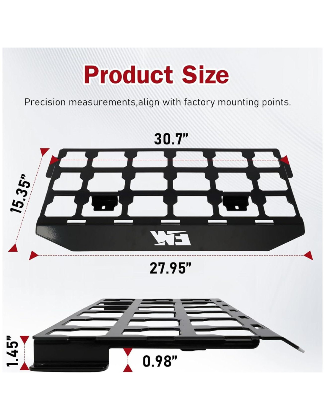- Fácil de Instalar y Usar: El montaje pack out utiliza los agujeros de montaje existentes y no requiere perforación. Simplemente atornilla este montaje packout directamente a tu cama. Perfecto para entusiastas del off-road y aventureros que desean mantener su equipo organizado y accesible