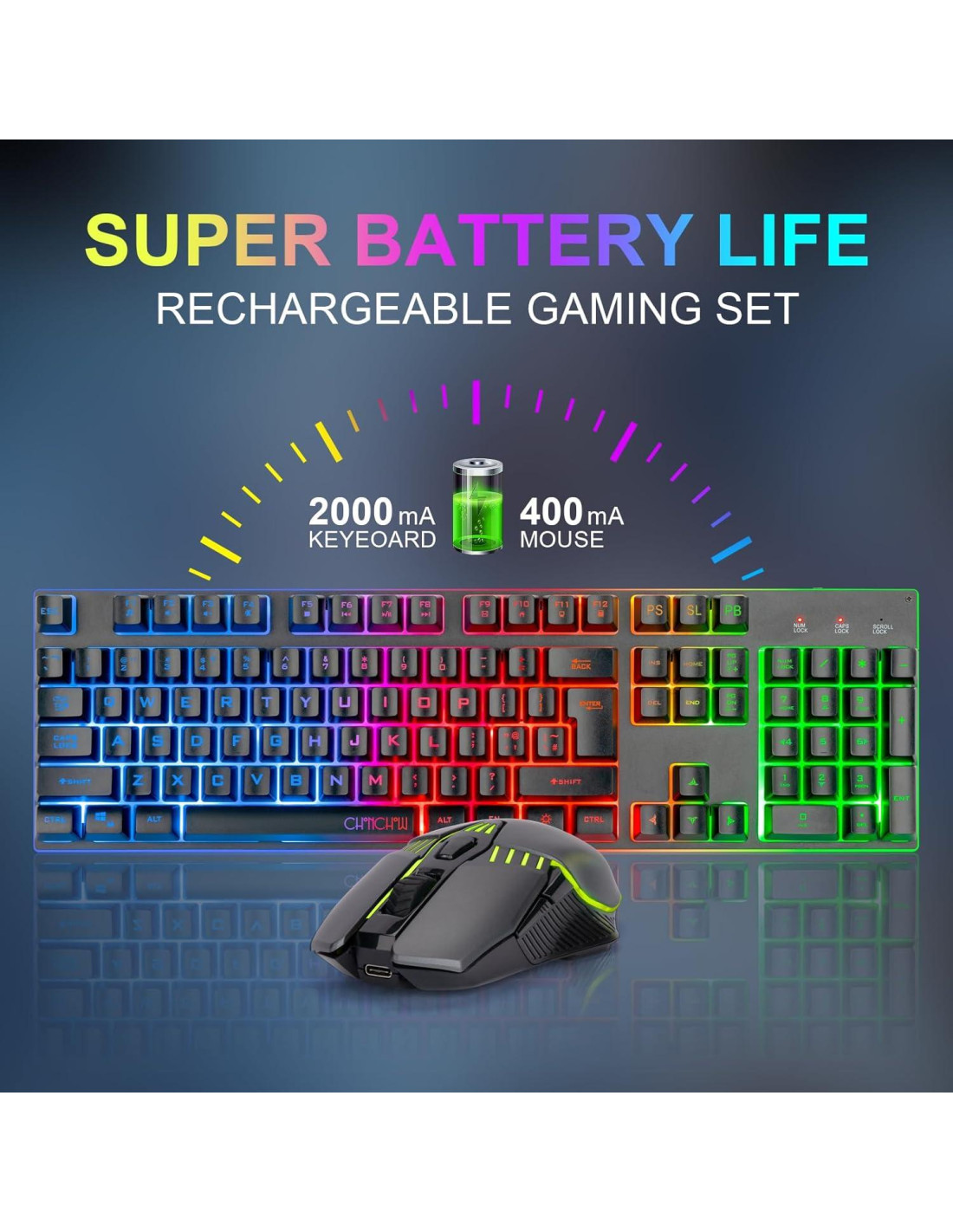 - [Recargable y Larga Duración de Batería] Este teclado recargable está equipado con una batería de 2000 mAh, puede soportar que las luces del teclado se mantengan encendidas durante más de 10 horas. El ratón está equipado con una batería de 400 mAh, puede usarse continuamente durante aproximadamente 12 horas. Soporta modo de sueño de ahorro de energía. Por favor, cárguelos con la fuente de 5V/2A estable.