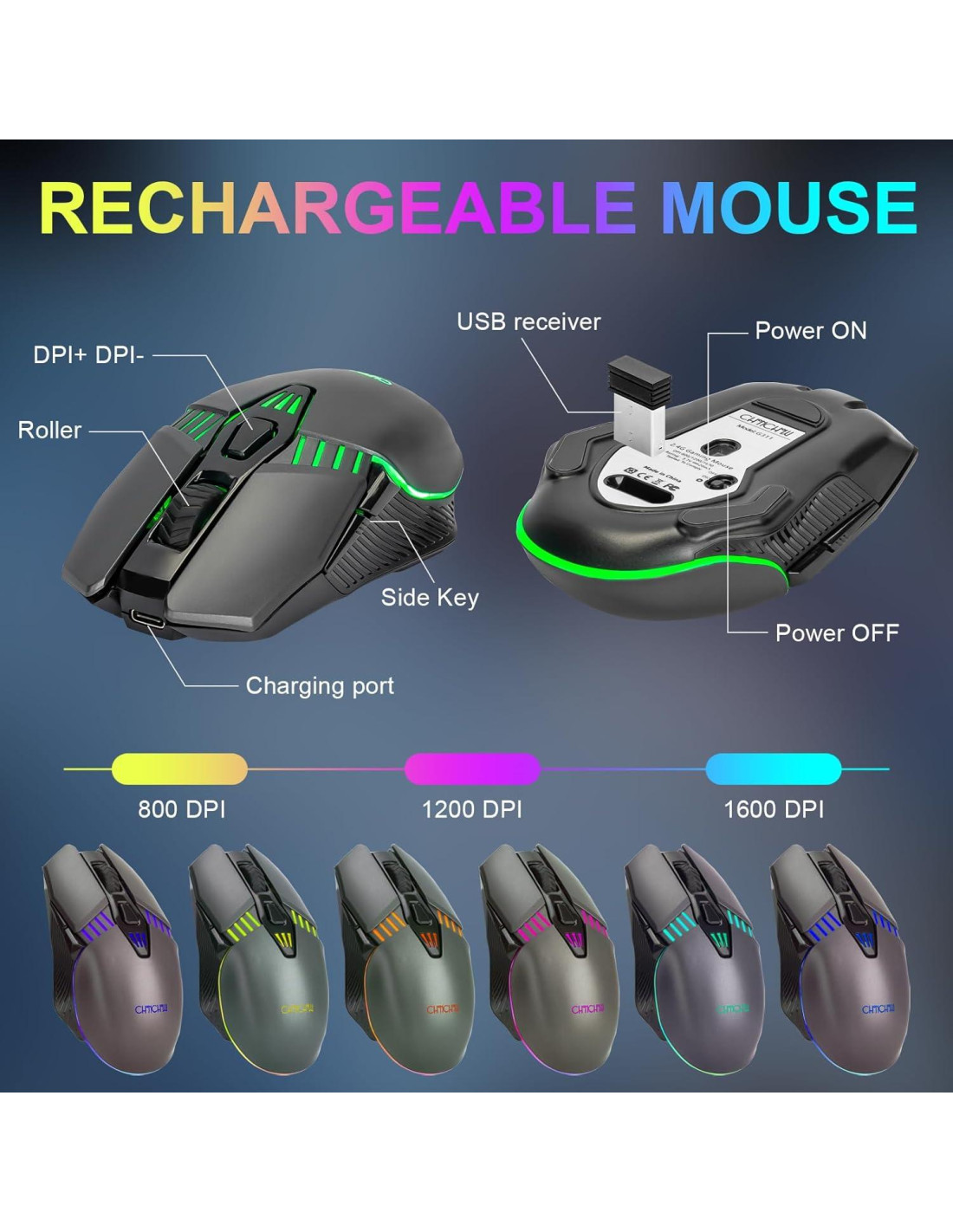- [Teclado y Ratón para Juegos] Teclado para juegos retroiluminado con 4 colores cambiables, 4 niveles de ajuste de brillo y 3 modos de respiración. El ratón tiene un efecto de iluminación cíclica gradual de 7 colores incorporado, 3 niveles de DPI ajustable (800, 1200, 1600). Transmisión de alta velocidad y estable de 2.4G, asegura que pueda lidiar fácilmente incluso con las batallas más intensas.