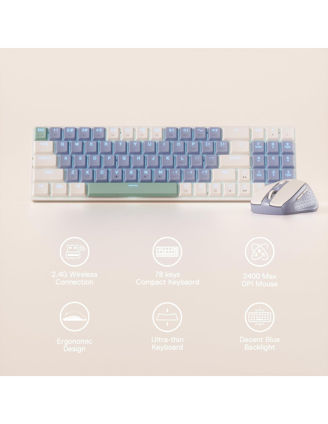 Combo de Teclado y Ratón Inalámbrico Redragon BS135, 75% 78 Teclas Teclado Mecánico Bajo Perfil Inalámbrico 2.4Ghz con Batería Recargable, Retroiluminación Azul Sólido, Ratón Ergonómico 2400 DPI