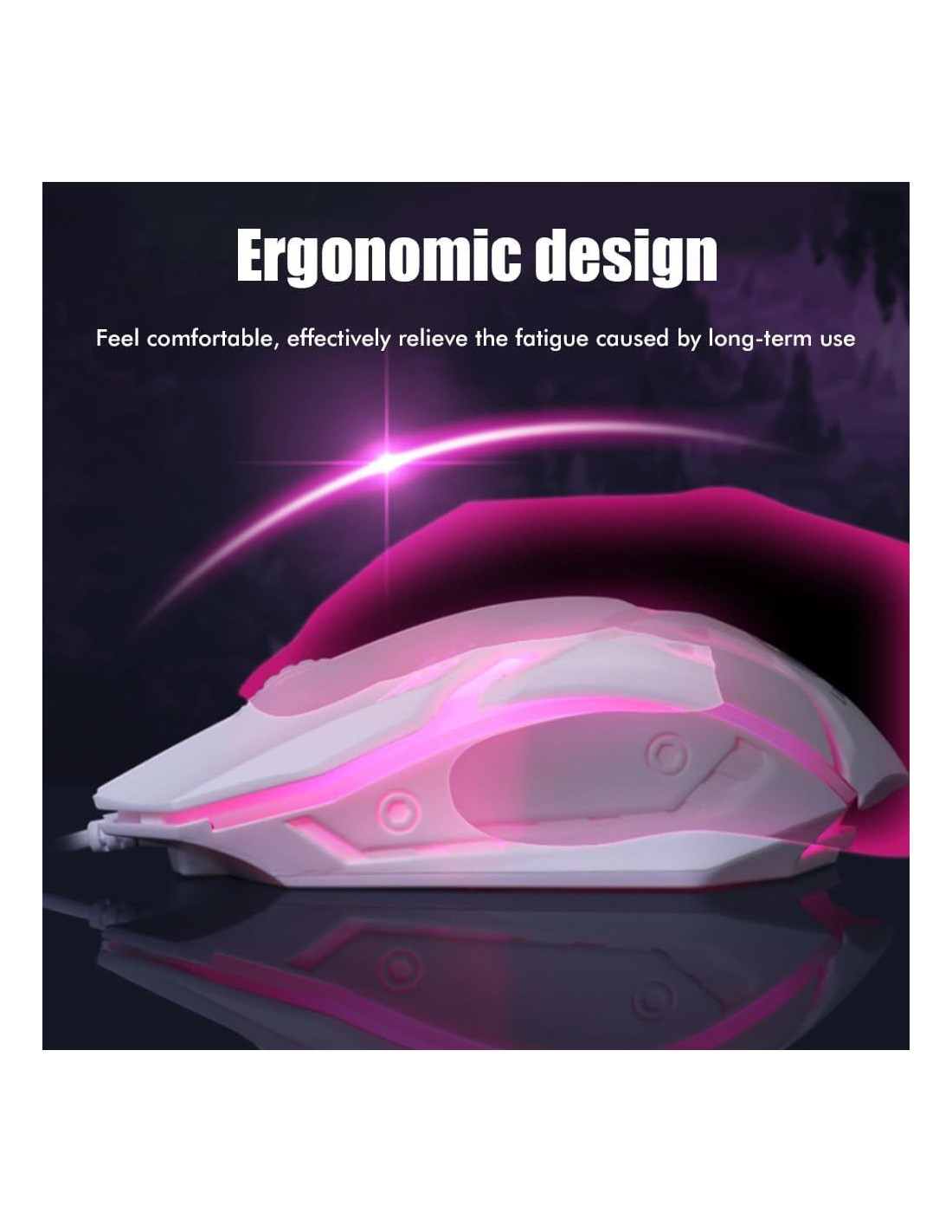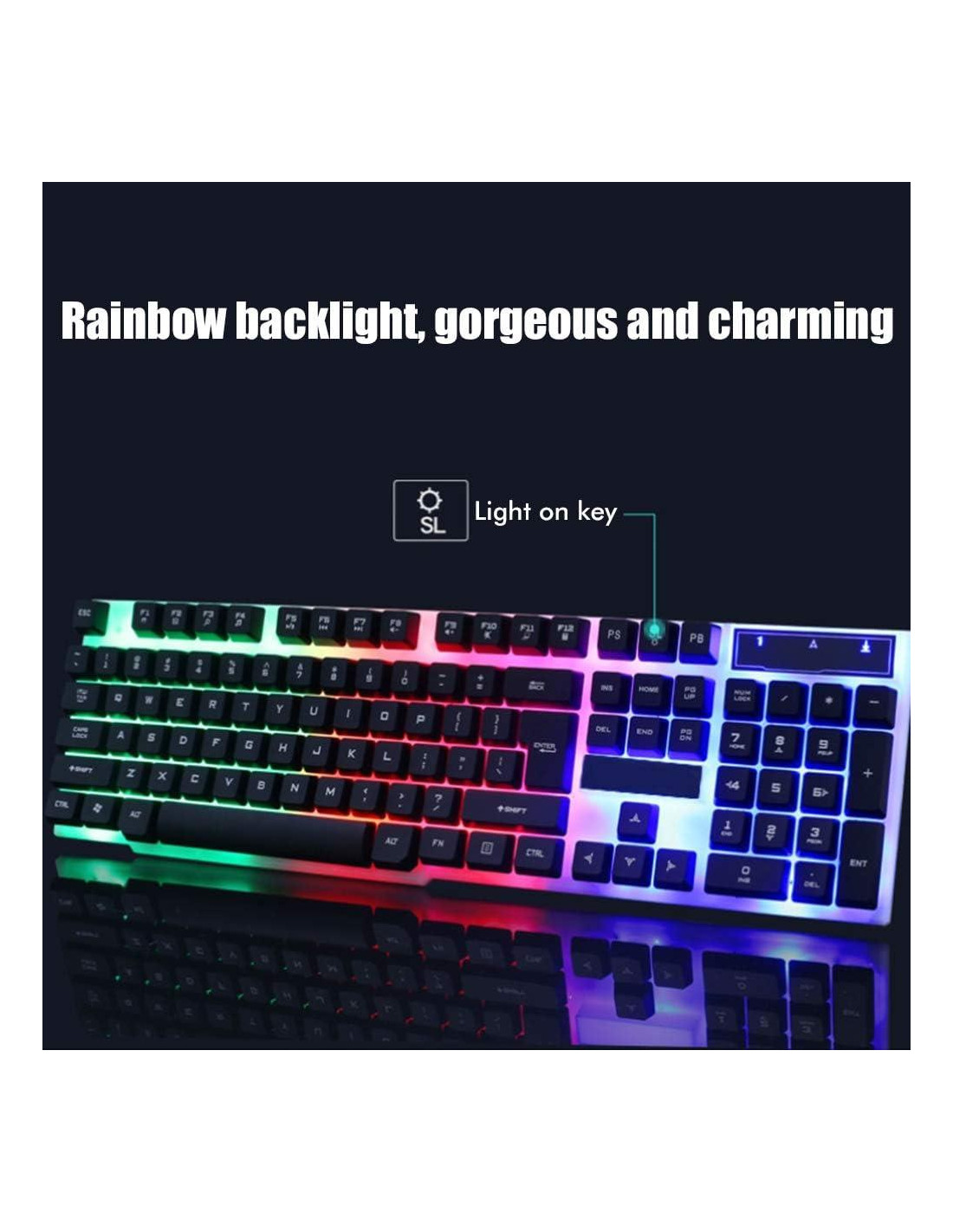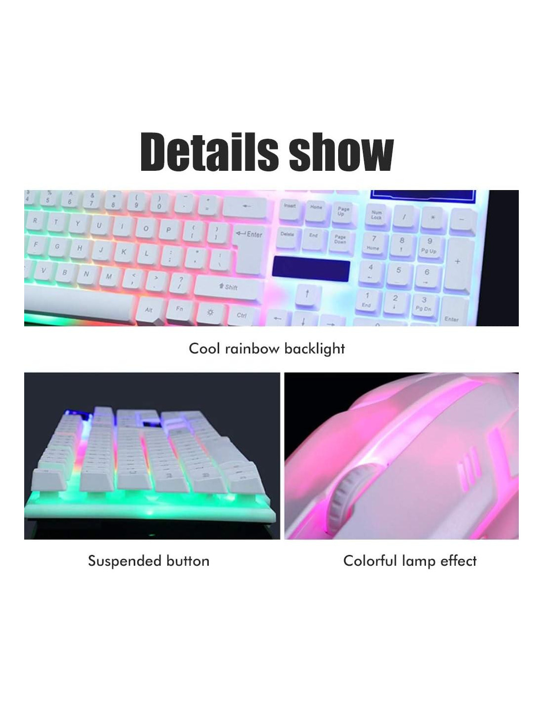 [Iluminación Colorida] Disfruta de una experiencia de juego dinámica con luces LED controladas por el bloqueo de desplazamiento. [Construcción] Construido con material ABS grueso para una durabilidad prolongada, asegurando un rendimiento. [Conjunto Gaming] Nuevo con iluminación LED vibrante, para jugadores de todos los niveles. [Uso Versátil] Ideal tanto para trabajo de oficina como para juegos en línea, atendiendo a una amplia gama de usuarios. [Rendimiento Mejorado] Velocidad de respuesta rápida, diseño ergonómico y bajo consumo de energía para una sesión de juego cómoda y eficiente. Especificaciones: Este es un teclado y ratón gaming robótico, con sonido claro, buena sensación y experiencia de usuario similar a un teclado mecánico. Control rápido de varias funciones, diseño ergonómico, cómodo. Compatible con Vista, 7, ME, 2000 y OS...o la última versión, ámbito de aplicación: PC de escritorio portátil. Material de la carcasa: plástico ABS Color: negro, blanco Puerto de interfaz: USB Resolución óptica: 1000dpi Número de teclas del teclado: 104 teclas Ámbito de aplicación: computadora de escritorio/portátil: Ratón: 7 * 12.5cm / 2.8 * 5 pulgadas (7 * 12.5cm) Teclado: 43 * 12.6 * 3cm / 17.0 * 5 * 1.2 pulgadas (43 * 12.6 * 3cm) Compatible con Vista, 7, ME, 2000 y OS...o la última, ámbito aplicable: PC de escritorio portátil Paquete incluido: 1*teclado gaming 1*ratón gaming