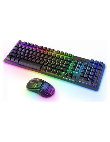 - Teclado y Ratón RGB con Iluminación Fresca: El teclado retroiluminado puede cambiar entre diferentes efectos de iluminación usando FN+F1~F5, y FN+Page Up/Page Down para ajustar el brillo o encender/apagar las luces. Al mantener presionado el botón izquierdo del ratón y presionar la tecla DPI, puedes cambiar entre diferentes modos de iluminación. Esto crea una emocionante e intensa atmósfera de juego RGB, o puede cambiarse a un modo de iluminación de un solo color.