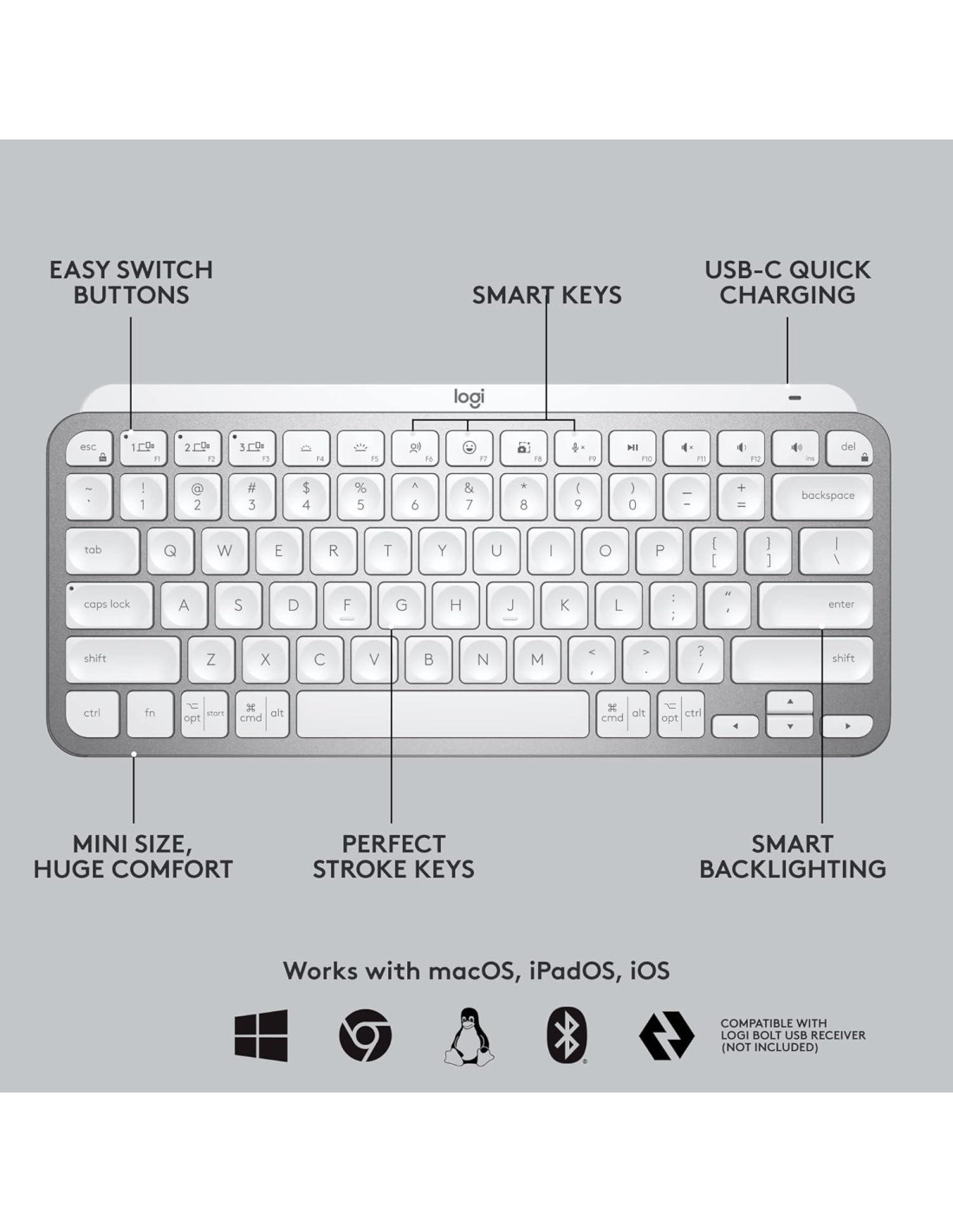 - Escritura fluida e intuitiva con Teclas Perfect Stroke: Las teclas del MX Keys Mini están diseñadas para adaptarse a tus yemas de los dedos, con teclas inteligentes de un toque para Silenciar/Activar Mic, Emoji y más