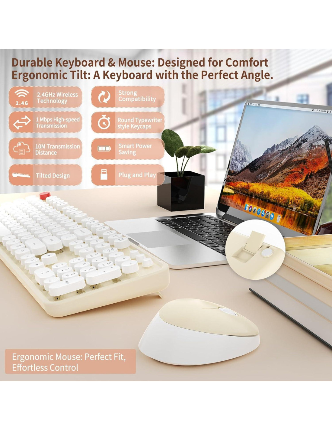 - Teclas Resistentes a la Degradación y Conexión Inalámbrica Estable Añade un toque de estilo a tu configuración con este combo de teclado y ratón inalámbrico color té con leche. Presenta teclas resistentes a la degradación y una conexión estable de 2.4GHz hasta 10 metros. Rápido plug-and-play - no se necesitan controladores.