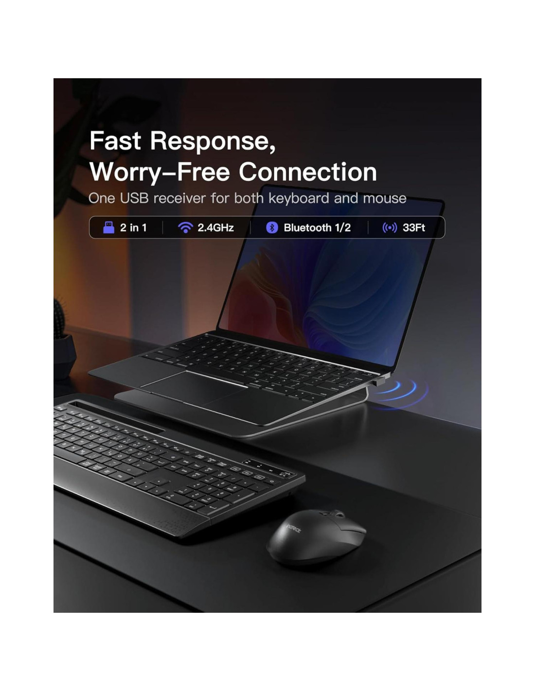 - Múltiples Opciones de Conexión Inalámbrica: El combo de ratón y teclado soporta conexiones inalámbricas duales Bluetooth y USB 2.4 GHz, permitiendo un emparejamiento fácil con varios dispositivos. Ya sea una laptop, escritorio o tableta, disfruta de una conectividad rápida y un cambio sin problemas. Nota: El receptor USB se encuentra en la parte posterior del ratón y conecta tanto el teclado como el ratón con un solo receptor USB