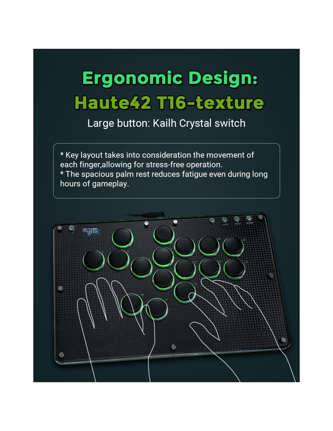 - [Paquete] Tamaño del producto: 29.6 x 19.6 x 1.2 cm, 0.93 kg. Incluye 1x Controlador de Arcade T16-textura, 1x Cable USB, Accesorios (1x Interruptor Kailh Crystal, 1x Extractor de Interruptor, 2x Tapas de Botón de 6mm), 1x Manual de Instrucciones.