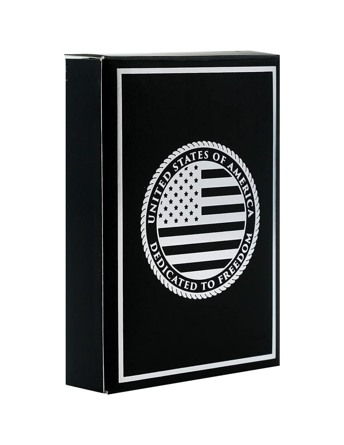 - SET DE FICHAS DE PÓKER DE ALTA CALIDAD - Cartas de juego de calidad profesional recubiertas en negro elegante con logo de bandera americana en relieve en plata en la caja y 5 dados grabados personalizados con 13 estrellas y Est. 1776. Gran regalo patriótico para la noche de póker familiar con el blackjack o juego de solitario. Estas son cartas y dados de estilo casino profesional almacenados en un soporte de fichas de póker de alta calidad
