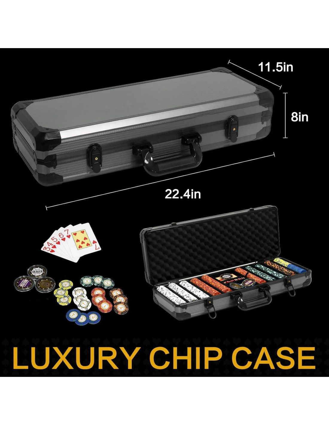 - Conjunto de Fichas de Póker: Fichas de Póker 500Pcs, Todos los conjuntos de póker incluyen: 2 barajas de cartas de plástico y Conjunto de Distribuidor de Metal, 5 Dados Acrílicos, 1 Estuche de Póker