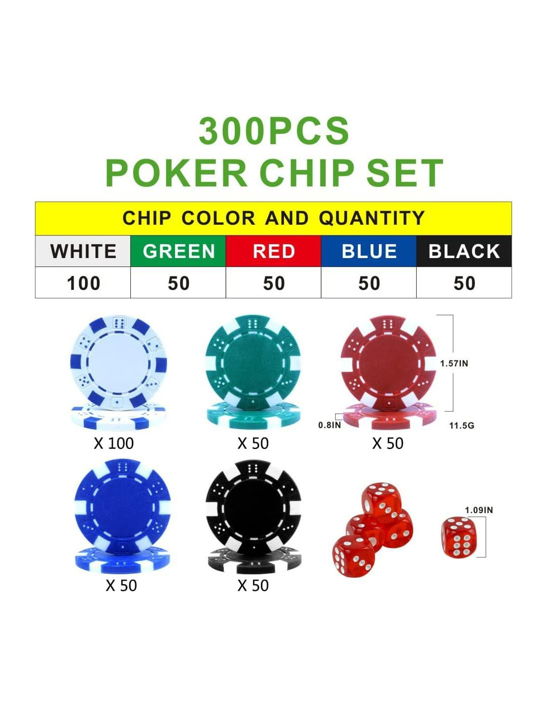 - Combinación Rica de Fichas: Nuestro juego de 300 fichas de casino contiene: 100 Fichas Blancas + 50 Fichas Verdes + 50 Fichas Rojas + 50 Fichas Azules + 50 Fichas Negras + 5 Dados + 2 Barajas de Cartas + 1 Botón de Repartidor + 1 Botón de Ciega Grande + 1 Botón de Ciega Pequeña + 1 Bolso de Tela Oxford de Alta Resistencia.