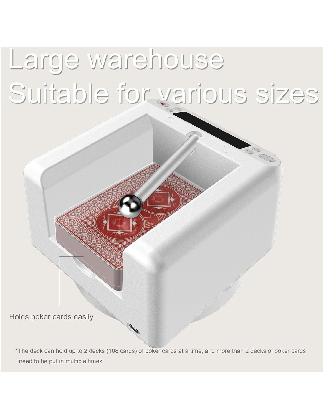 - Automático y Eléctrico: 2800MAH, larga duración, puede jugar de 3 a 7 días - doble absorción de choque, base super grande, bajo ruido, arquitectura de motor dual antideslizante, cartas estables. La máquina distribuidora de cartas automática no necesita estar enchufada para usarse, solo usa el TYPE-C incluido para cargar cuando se agote la batería.