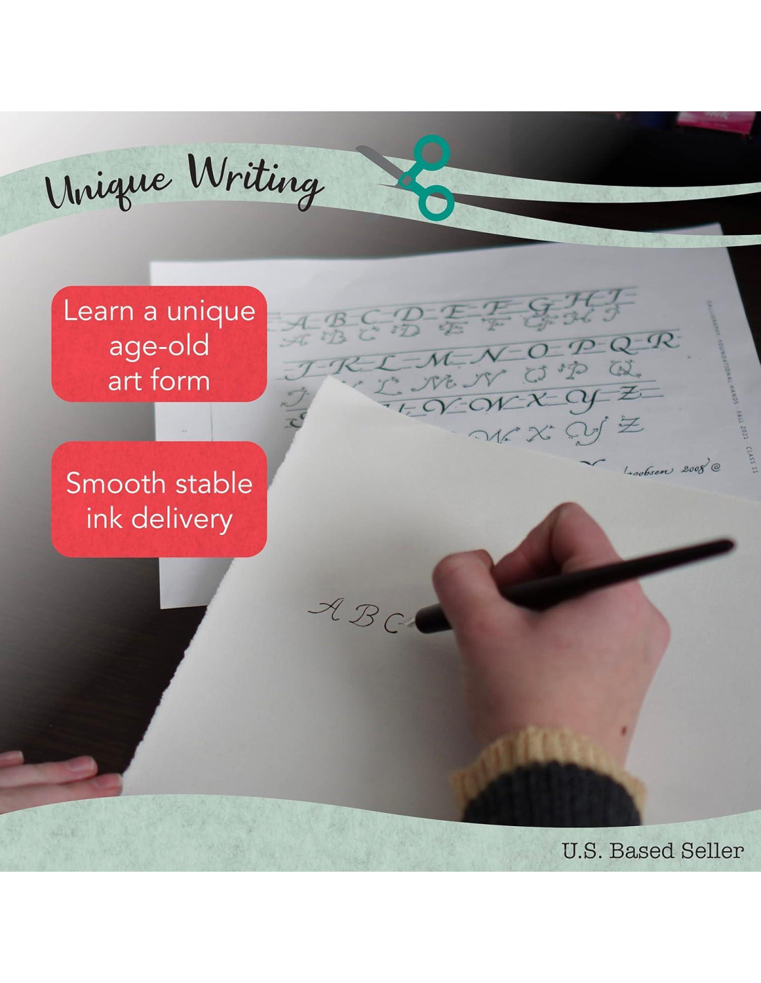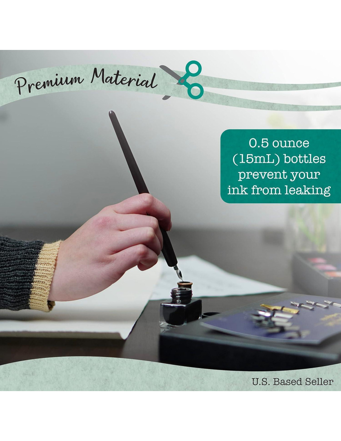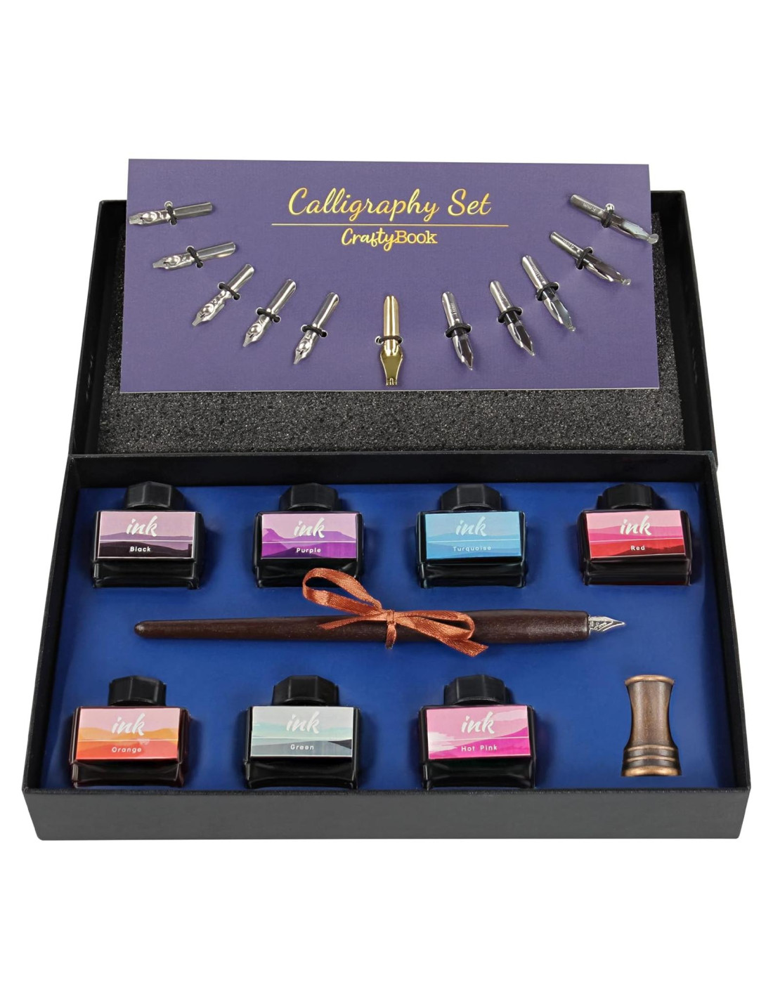 Practica diferentes estilos de letras a mano cuando uses el Kit de Caligrafía CraftyBook con Plumas de Buceo, Puntas y Tinta. 12 puntas de pluma premium ofrecen versatilidad en el grosor de línea y diseño, asegurando una entrega suave, control superior y estabilidad, mientras también previenen manchas de tinta. Las gruesas plumas de diario de madera están contorneadas para un agarre cómodo y pueden ser utilizadas como plumas de caligrafía para diestros o zurdos. Agrega un toque de elegancia a tus tarjetas e invitaciones o crea tus propios dibujos modernistas con estos kits de pluma de letras a mano. 7 frascos de tinta de caligrafía proporcionan 15mL (0.5oz) de tinta de pluma de buceo de colores brillantes en rojo, naranja, rosa fuerte, púrpura, verde, turquesa y negro. Advertencia: Este producto puede exponerlo a químicos que son conocidos por el Estado de California por causar cáncer y defectos de nacimiento u otros daños reproductivos.