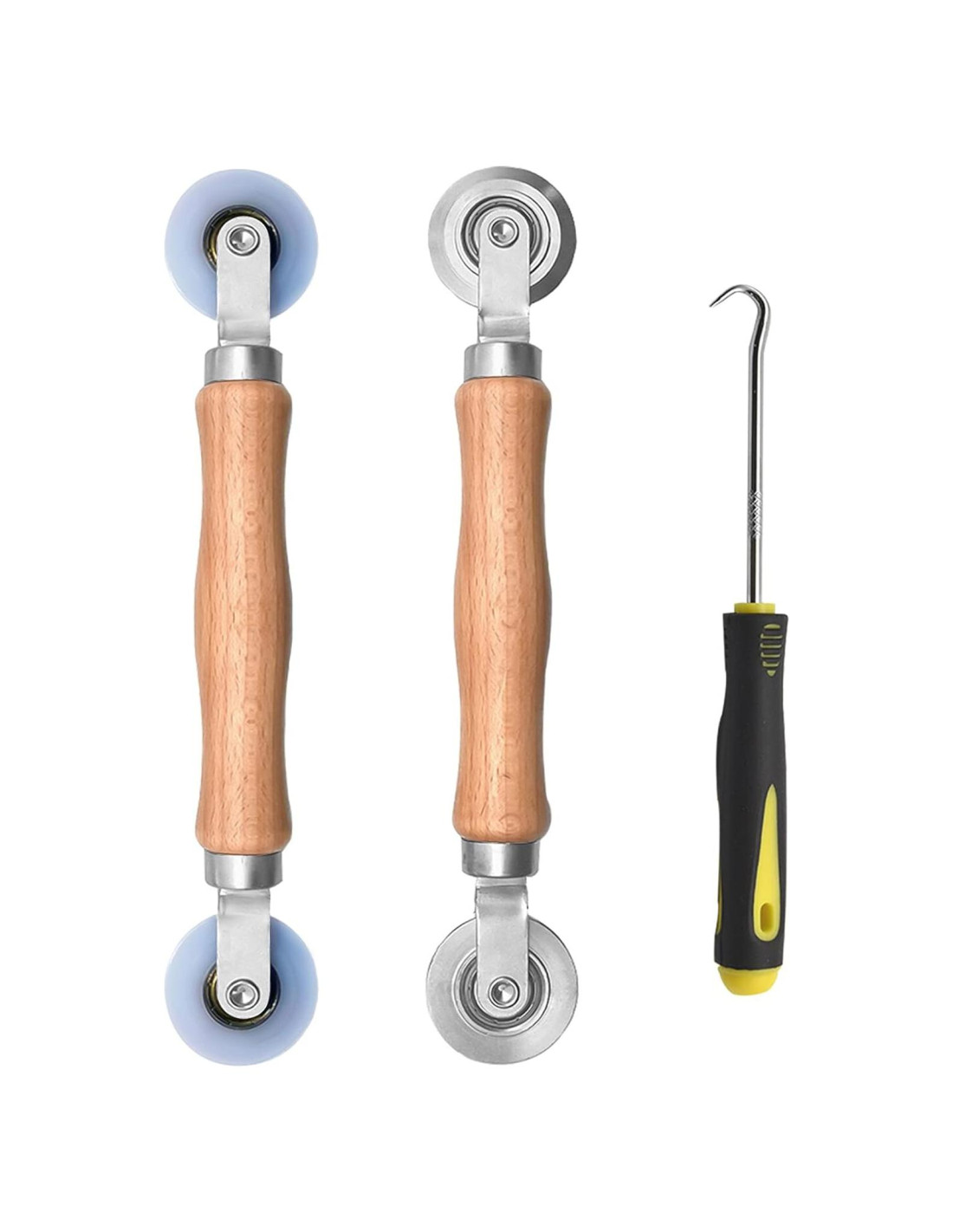 - Nueva combinación: Las ruedas de rodamiento bien ajustadas evitan el tambaleo mientras trabajas. El gancho de extracción de spline de retención de pantalla se utiliza para quitar el viejo spline de retención de pantalla, y el rodillo de pantalla se utiliza para instalar la nueva malla de pantalla y el rodillo de pantalla.