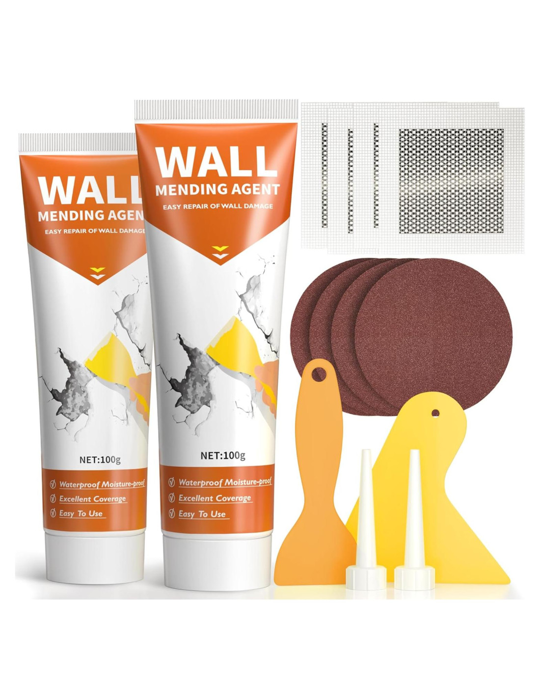 - Kits de Reparación Completa Pasta de Reparación de Pared (100 g), Extensores de Boquilla, Espátula de Plástico, Papel de Lija, Parche de Pared. Una opción rentable para reparar agujeros y grietas en paredes