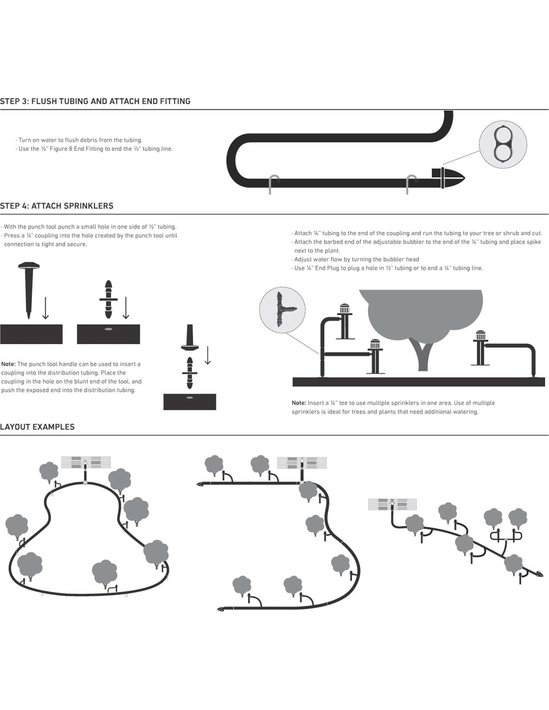 - La manguera flexible permite la instalación alrededor de árboles, arbustos, parterres y otras características paisajísticas existentes